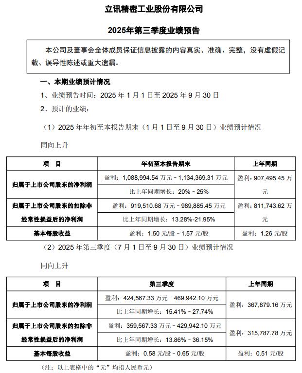 立讯精密发布2025年第三季度业绩预告,预计2025年前三季度归属于上市公司股东的净利润为108.9亿元到113.44亿元,同比增长20%-25%。其中,预计第三季度归属于上市公司股东的净利润为42.46亿元到46.99亿元,同比增 ...