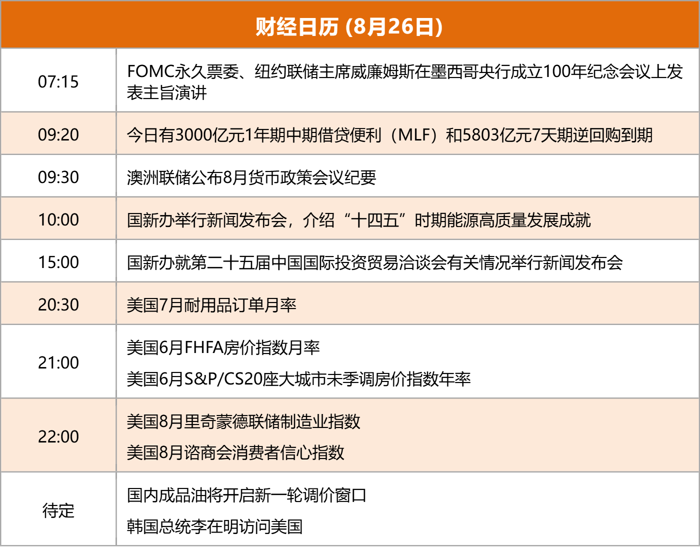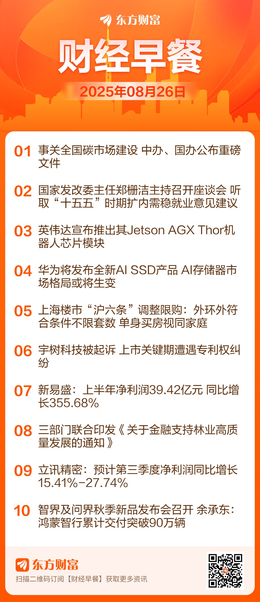 ![]() 每日精选碳市场建设: 中共中央办公厅、国务院办公厅《关于推进绿色低碳转型加强全国碳市场建设的意见》对外公布。主要目标是:到2027年,全国碳排放权交易市场基本覆盖工业领域主要排放行业,全国温室气体自愿减排交易市场实现重点领域全覆盖。到2030年,基本建成以配额总量控制为基础、免费和有偿分配相结合的全国碳排放权交易市场。 房地产: 8月25日,上海市住建委、市财政局等六部门联合印发《关于优化调整本市房地产政策措施的通知》,出台包括调减住房限购、优化住房公积金、优化个人住房信贷以及完善个人住房房产税等政策。包括外环外符合条件不限套数,单身买房视同家庭,不再区分首套、二套住房商贷利率,完善房产税政策等措施。 扩内需稳就业: 8月25日,国家发展改革委主任郑栅洁主持召开企业座谈会,围绕科学编制“十五五”规划,听取关于扩内需、稳就业等方面意见建议。郑栅洁主任表示,国家发展改革委将深入贯彻落实党中央、国务院决策部署,不断完善扩内需政策举措,积极营造公平竞争市场环境,支持企业加快技术和产品创新、增加优质供给,扎实稳就业扩就业、促进高质量充分就业。 英伟达推出“机器人大脑” 北京时间8月25日晚间,英伟达宣布推出其Jetson AGX Thor机器人芯片模块。这款被称为“机器人大脑”的芯片将于下个月发货,客户将能够用它来制作机器人原型。据悉,新的Jetson AGX Thor 开发者套件起售价为3499美元,即日起将向包括中国在内的全球客户开放销售。 电子首超银行: 8月25日,电子行业涨超2%,板块A股市值报11.67万亿元,在31个申万一级行业中居首,首次超过银行板块,第二名银行的A股市值为11.39万亿元。今年以来,电子大涨33%,A股市值增加了3.75万亿元。不过,总市值方面银行仍大幅领先电子。东方财富Choice数据显示,银行最新总市值为15.83万亿元,电子总市值为12.43万亿元,电子与银行之间仍有约3.4万亿元的总市值差价。 宇树科技被起诉: 天眼查APP显示,宇树科技近日新增1条开庭公告,原告为杭州露韦美日化有限公司,案由为侵害发明专利权纠纷。该案件将于8月26日在杭州市中级人民法院开庭审理。宇树科技目前有7款机器狗产品,分别是GO2、GO1、A1、A2、B1、B2和Aliengo,分为消费级和行业级。目前尚不清楚是哪一款产品与原告产生专利纠纷。 恒大退市: 根据此前安排,中国恒大最后的上市交易日定在8月22日,不过,当天并未复牌进行交易,而是经过了周末两天后,今日(8月25日)中国恒大直接从港交所退市。在港交所披露易中,“现有上市证券”类型中已经无法搜索中国恒大,该公司正式被列入“已除牌证券”。这意味着,中国恒大从8月25日起正式宣告退市。 并购交易: 据普华永道8月25日发布的《2025年中国企业并购市场年中回顾及展望》统计,2025年上半年中国企业并购市场披露交易总额超过1700亿美元,较去年同期大幅增长45%。其中,超大型并购成交易额大增的“主引擎”,行业集中于高科技、大健康和工业领域。 芯原股份询价转让: 继上周五发布询价转让公告后,25日盘后,ASIC芯片龙头芯原股份公告称,已初步确定转让定价情况。公告显示,根据2025年8月25日询价申购情况,确定本次询价转让价格为105.21元/股。以芯原股份今日收盘价157.9元/股计算,此次询价转让价格大约将折让33.4%。本次询价转让拟转让股份已获全额认购,初步确定受让方为37家机构投资者,拟受让股份总数为2628.57万股,占总股本5%。 热点题材华为AI存储器: 华为将于8月27日发布全新AI SSD(固态硬盘)产品,可以有效满足AI训练推理过程中的超大容量和超强性能的需求,助力AI训练推理、大模型部署。此外据悉,华为计划与一体机厂商合作,改变现有局面,为AI存储器市场注入新活力,带来更多的可能性。 华为汽车: 8月25日下午,智界及问界秋季新品发布会在成都举办。会上,问界M8纯电版、智界新S7和新款智界R7等新品发布。最新数据显示,尚界H5开启预售1小时小订突破2.5万台。余承东宣布,鸿蒙智行累计交付突破90万辆,连续14个月蝉联中国汽车品牌成交均价第一名。 卫星互联网: 记者获悉,相关部门近期将会发放卫星互联网牌照。卫星互联网领域一位资深技术专家表示:“牌照的发放,意味着我国卫星互联网商业运营迈出第一步。但要实现像星链那样提供卫星互联网服务,仍需2~3年左右的时间。” 林业: 中国人民银行、金融监管总局、国家林草局联合印发《关于金融支持林业高质量发展的通知》。《通知》强调,要聚焦国家储备林建设、“三北”工程等重要生态工程建设,探索多元化投入机制,强化金融服务需求对接。针对林业适度规模经营主体特点,提供适配的金融产品与服务,积极满足林下特色产业培育、原料收储及精深加工、转型升级、冷链保鲜和物流等融资需求,综合运用信贷、股权、债券等融资方式,促进林业一二三产业融合发展 AI大模型: 特斯拉CEO马斯克在X上官宣,xAI去年最好的模型Grok-2.5正式开源,同时,Grok-3也将在大概6个月内开源。马斯克同时发表观点表示,xAI很快就会超越除谷歌外的任何公司,然后也将超越谷歌,“但中国公司将是最强劲的竞争对手,因为他们的电力比美国多得多,而且在硬件建设方面实力超强。” 算力 媒体报道,从2025中国算力大会上了解到,中国算力平台正加快建设。目前,已有山西、辽宁、上海、江苏等10个省区市的算力