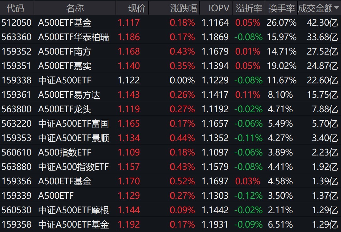 每经记者|叶峰 每经编辑|肖芮冬 市场早盘探底回升,三大指数小幅上涨,中证A500指数上涨0.34%。 从板块来看,游戏股集体走强,算力股维持强势。下跌方面,稀土永磁概念股展开调整。 截至上午收盘,场内多只跟踪中证A500指数的ETF小幅上涨。其中,有15只中证A500相关ETF成交额超1亿元,3只超27亿元。A500ETF基金、A500ETF华泰柏瑞、A500ETF南方早盘成交额分别为42.3亿元、33.68亿元、27.52亿元。 有券商表示,近期科技权重对大盘涨幅贡献较大,权重股“搭台”后,可关注中小票的补涨机会。中期来看,“反内卷”政策及需求端政策将是影响A股市场高度的重要因素,居民储蓄存款入市将是市场指数走强的重要支撑。继续维持指数震荡偏强运行、积极参与A股市场的判断。