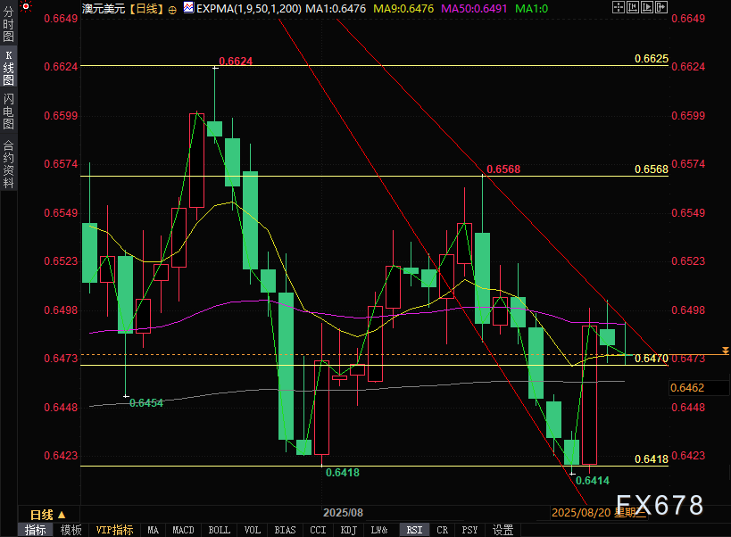 澳元兑美元周二(8月26日)窄幅震荡,目前交投于0.6480附近。由于美国总统特朗普警告称若中国拒绝向美国供应稀土磁铁,将对中国商品征收200%关税,澳元兑美元持续承压。值得关注的是,中澳作为紧密的贸易伙伴,中国经济形势的任何变化都可能对澳元产生影响。 ![]() 美元指数(DXY)同样面临压力,美国总统特朗普解除美联储理事库克职务后,市场对美联储独立性的担忧持续发酵。特朗普于周二早间在社交媒体发布声明,宣布解除库克在美联储董事会的职务,此举将使特朗普得以提名继任者,从而加强对美联储政策走向的控制。 避险情绪下澳元依然承压 美元指数周二早盘一度下跌0.3%,至98.09,但目前震荡回升至98.35附近,跌幅约0.08%。交易商正等待即将公布的美国第二季度国内生产总值年化数据以及7月个人消费支出价格指数。 据彭博社报道,特朗普总统威胁将对先进技术和半导体征收“后续附加关税”并实施出口限制,以报复针对美国科技公司的数字服务税。 美联储主席鲍威尔上周五在杰克逊霍尔研讨会上表示,就业市场风险正在上升,但同时也指出通胀仍是威胁,且政策决定尚未最终确定。鲍威尔还强调,美联储仍认为不必仅基于就业可能超过最大可持续水平的不确定预测就收紧政策。 截至8月16日当周,美国初请失业金人数升至23.5万,创八周新高且高于共识预测的22.5万,表明劳动力市场状况出现疲软迹象。 强劲的PMI数据与上升的失业金申领人数形成鲜明对比,凸显美联储在权衡持续通胀压力与劳动力市场疲软证据方面面临的挑战。根据CME FedWatch工具,联邦基金期货交易员目前预计9月降息概率为74%,较周三的82%有所下降。 芝加哥联储主席古尔斯比上周四表示,9月美联储会议仍可能采取行动。他进一步指出,美联储近期收到的经济信号好坏参半。波士顿联储主席柯林斯则表示对9月降息持开放态度,理由是关税逆风和潜在劳动力市场疲软,尽管短期通胀风险依然存在。 标普全球美国综合PMI初值在8月加速至55.4,前值为55.1。与此同时,美国制造业PMI从前值49.8升至53.3,远超市场预期的49.5。服务业PMI从55.7放缓至55.4,但仍强于54.2的预期值。 后市展望 澳元兑美元的短期走势,将很大程度上取决于多方因素的博弈结果。市场对美联储降息的预期与对澳洲联储未来降息幅度的预期之间的较量,即将公布的澳大利亚7月CPI数据3以及美国的PCE通胀数据等,中美贸易关系的进展以及全球经济增长前景的变化等,都对澳元兑美元后续走势具备显著影响。 技术分析 日线图技术分析显示,澳元兑美元正尝试突破下降通道形态,暗示可能从看跌转向看涨趋势。 汇价目前位于九日指数移动平均线(EMA)(0.6476)上方,表明短期价格动能增强。 上行方面,澳元兑美元正在测试0.6590附近(下降通道上轨与50日指数移动平均线0.6491交汇处)的即时阻力区域。若成功突破该关键阻力带,将确认看涨趋势转换,推动汇价上探8月14日创下的月内高点0.6568,继而挑战7月24日创下的九个月峰值0.6625。 下行方面,澳元兑美元或将在九日指数移动平均线0.6476处获得初步支撑。跌破该水平将削弱短期价格动能,令汇价承压下行并下探8月21日录得的两个月低点0.6414。若继续下跌,将在6月23日触及的三个月低点0.6372(与下降通道下轨重合)附近获得支撑。 ![]() 北京时间14:37,澳元兑美元交投于0.6480/81。 ![]() |
