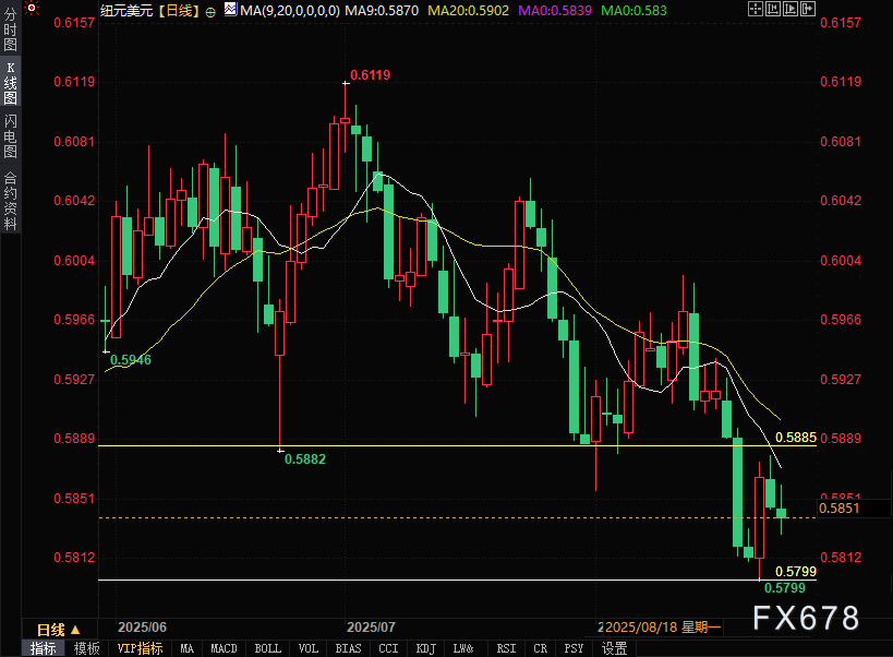 纽元兑美元正在回吐此前涨幅,从周一(8月25日)0.5880高位回落后,重返0.5800区间低位,交投于0.5840附近。由于特朗普试图罢免美联储理事库克,市场避险情绪升温,令风险敏感型货币纽元承压。 ![]() 对美联储独立性的质疑或拖累美元走势 过去数月间,特朗普持续抨击美联储并施压降息。这场侵蚀美联储独立性信心的博弈最新进展,可能长远动摇美元作为储备货币的地位。 目前纽元兑美元仍维持在上周交易区间中段。美元指数(DXY)周二亚市早盘一度下跌0.30%,至98.09,但目前在市场情绪恶化背景下从周初低点反弹,震荡回升至98.40附近。 新西兰周一公布的数据显示,今年第二季度零售销售表现优于预期。这些数据凸显出经济的韧性,缓解了上周新西兰联储鸽派货币政策声明带来的部分压力。 技术分析 从技术角度看,纽元兑美元目前处于关键位置: 下行方面,汇价在0.5800水平附近似乎找到短期支撑,该水平接近今年4月以来的也是近期的低点。 上行方面,近期汇价尝试反弹,但整体仍承压于9日简单移动平均线(SMA)(0.5870)关键阻力下方,如果突破该阻力位,还需克服20日简单移动平均线(0.5902)阻力位才能打开更多反弹空间。 新加坡大华银行(UOB)的分析师认为,纽元兑美元在进一步盘整之前,有测试0.5885的空间。他们指出,纽元似乎已进入一个区间交易阶段,短期内可能在0.5820至0.5920之间波动。 ![]() 后市展望 短期内,纽元兑美元走势可能继续受以下因素影响: 美联储与新西兰联储的政策存在差异,两国央行的货币政策分歧仍是该货币对变动的主导因素。 全球贸易格局变动及市场避险情绪的变化会影响纽元需求。 北京时间16:48,纽元兑美元交投于0.5839/40。 ![]() |