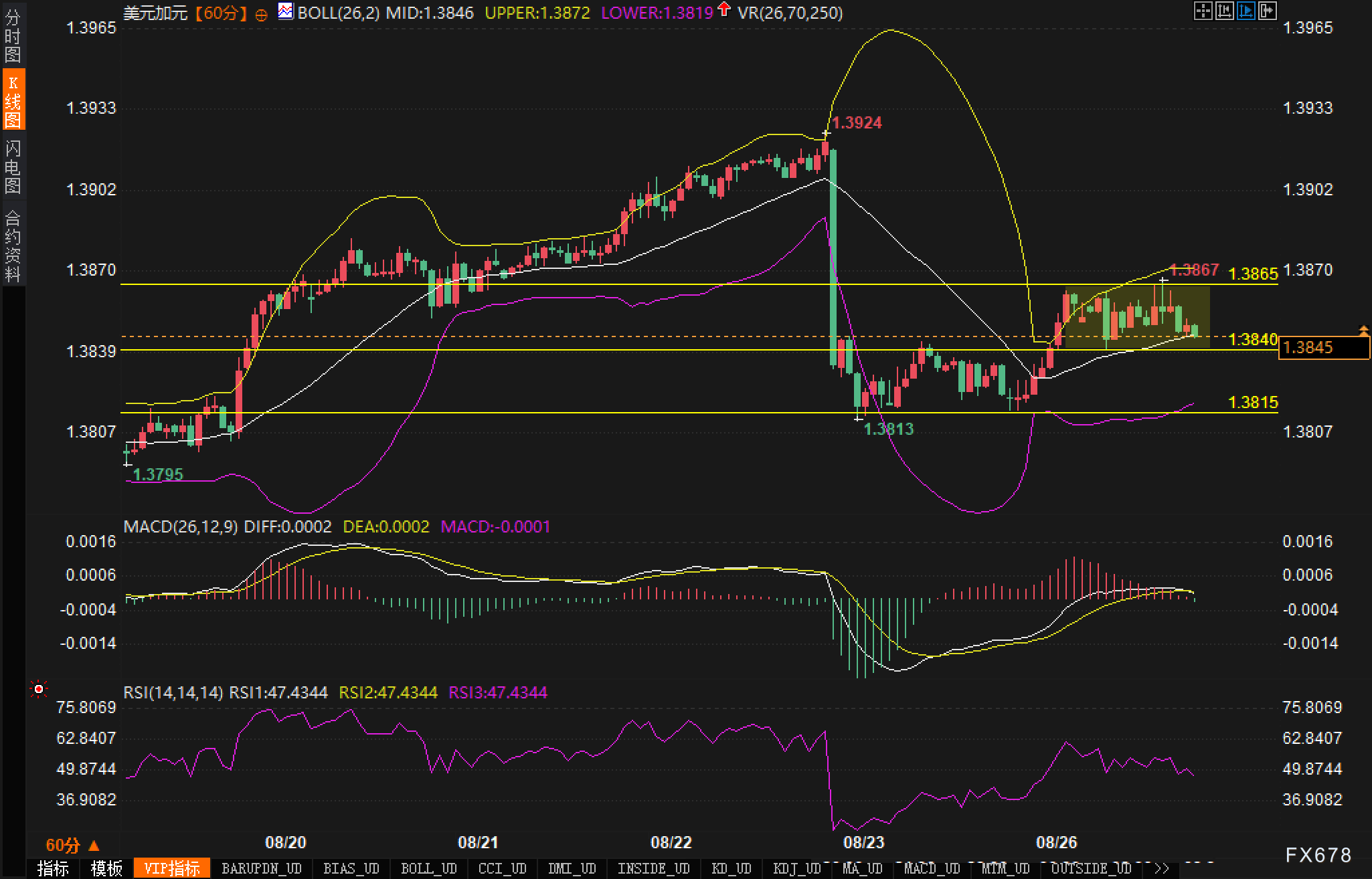 周二 8月26日 美元兑加元美市盘前承压回撤 汇价自盘中高点1 3870一线受阻后 回落至1 3850下方 日内由涨转跌 此前一度在1 3924附近遇阻快速下挫 最低回探1 3813 眼下小时级别进入1 3840—1 3865的窄幅整 ...