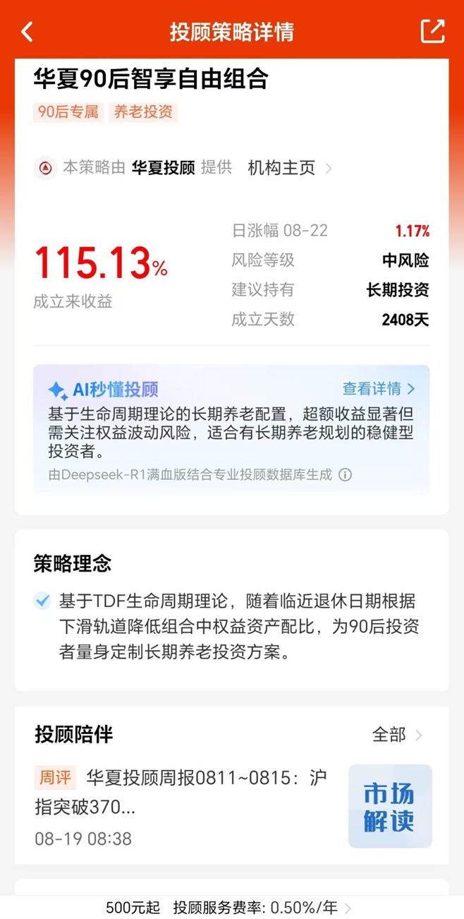 每经记者|李娜 每经编辑|赵云 上证指数逼近3900点关口,以往备受诟病的基金投顾组合也终于翻身,迎来了翻倍时代。 据《每日经济新闻》记者了解,华夏财富、嘉实财富、中欧财富等机构旗下部分基金投顾组合收益率突破100%。截至8月22日,华夏财富旗下90后智享自由组合成立以来的收益率达到了115.13%,嘉实财富旗下的嘉实全明星精选组合成立以来的收益率也达到了115.07%。 另据了解,有些基金公司的基金投顾规模今年以来已实现翻倍。 这些经历过牛熊交替,以及多次极端市场行情检验的基金投顾组合,会进入你的投资备选池吗? 4只基金投顾组合收益翻倍市场量价齐升,少数基金投顾组合的收益率随之实现翻倍。 数据显示,截至8月22日,华夏财富旗下90后智享自由组合,自2019年1月21日成立以来的收益率达到了115.13%。该组合是基于TDF生命周期理论,为90后投资者量身定制长期养老投资方案。截至8月22日,其组合配置中主动权益基金为主导,混合型基金占比为63.08%,股票型基金占比为30.97%,债券型基金占比为3.97%,货币型基金占比为1.98%。行业配置上,前三大行业分别为通信、机械设备、电力设备,其占比分别为4.85%、2.98%、2.91%。 同日成立的华夏权益优选组合,成立以来收益率也达到了103.72%。该投顾组合采取的是核心卫星策略,精选市场20只左右的权益基金。 同样,截至8月22日,嘉实财富旗下的嘉实全明星精选组合,自2018年3月1日成立以来的收益率也达到了115.07%。该组合则是以80%股票基金、20%债券基金为长期资产配置中枢。 而中欧财富旗下的中欧超级股票全明星组合自2017年9月5日至2025年8月22日,组合收益率达到了100.2%,超越业绩比较基准,且成立以来年化收益率为9.39%。 此外,华夏财富投顾旗下的华夏常青藤教育金组合,权益仓位为55%左右,成立以来净值涨幅也接近翻倍。 对比公募FOF产品,以海富通聚优精选为例,该基金为一只偏股混合型FOF,于2017年11月16日成立。Wind数据显示,自2019年1月21日至2025年8月22日,其净值涨幅为60.3%,成立以来净值涨幅为31.05%。 北京某公募基金人士向每经记者表示:“当前FOF主要集中在持有期、目标风险和目标日期等几个特定种类,与投顾相比,给客户的选择性较少。投顾组合的布局更为丰富,适配不同客户的需求,且”翻倍“的路径(时间、过程中的风险收益、使用的策略框架)也更丰富,同时因为投顾的透明度、流动性和更丰富的陪伴及投教内容,客户对账户化的服务了解会更充分及时,这是FOF基金所不具备的。” 2019年10月,中国证监会机构部发布了《关于做好公开募集证券投资基金投资顾问业务试点工作的通知》,公募基金投资顾问业务试点正式落地。 值得注意的是,上述投顾组合的成立时间早于试点开始时间。这些组合最初作为基金组合运作,后在获取投顾牌照后转为投顾模式,并平移了原有业绩。不过,由于很多投顾持有人是在转换之后才买入的,因此其实际获得的收益并没有组合业绩所显示的那么高。 翻倍投顾组合的基因分析这些基金投顾组合,可以发现它们在经历了过去牛熊交替市场的多重锤炼后,形成了相似的优秀基因。 华夏财富相关投研人士将其成功归结为五个关键方面:把握权益市场投资机会、采用权益内部“核心+卫星”的配置结构、具备优秀的基金筛选能力、实施动态调仓管理以及坚守投资纪律。 “核心底仓保证跟上市场的表现,坚持分散化原则,精挑细选风格稳定、长期具备良好绝对收益能力和高夏普比率(风险收益性价比高)的优质基金作为组合基石。卫星仓位通过优选行业及主题基金进行收益增强,比如积极布局当前处于周期底部或估值洼地的特定行业或风格主题基金,以捕捉阶段性的超额机会,提供进攻性。”该投研人士进一步分析指出。 中欧财富相关人士在回顾过往的投资时告诉记者:“经历了2022年较为极端的市场环境后,我们对超级股票全明星的投资方法论进行了优化迭代。首先,在组合设计层面,将组合架构从原有的”单核心+卫星“双层体系,升级为”双核心+卫星“三层体系。此前的策略主要依赖”风格核心“跟踪偏股基金指数,在2022年风格快速轮动的极端市场环境下该架构在投资管理上遇到了一些挑战。” 此外,记者发现,华夏财富90后智享自由组合在成立以来的6年多时间里,调仓次数达到14次;华夏财富权益优选组合同期调仓27次;嘉实财富全明星精选组合成立以来调仓19次;中欧财富的超级股票全明星组合自成立以来调仓次数达到30次。 对此,前述华夏财富投研人士指出,投顾组合的调仓主要聚焦在两方面,一方面是仓位的调整,在市场低位或出现机会时,增加权益仓位,例如在2024年“924”行情前维持较高的仓位,以及今年4月初市场调整之后通过调仓增加权益仓位。另一方面是对权益内部结构优化来提升组合表现。在全市场范围内精选基金,把握行业和主题基金的投资机会。 嘉实财富相关人士则是指出,短期(数年)“翻倍”潜力的投顾组合中,最成功的驱动因素之一是投研和策略团队会去识别“长牛”资产,并以长牛资产为配置基石,在确定性较高的大周期趋势下,做高胜率的调整;同时,利用期限-目标-胜率的匹配,引导客户正确选择,做出合理预期。 新旧资金交替随着越来越多的老基金解套,不少券商和基金公司相关人士表示,权益投顾组合已从亏损步入盈利状态。 那么,当下投资者对基金投顾组合持怎