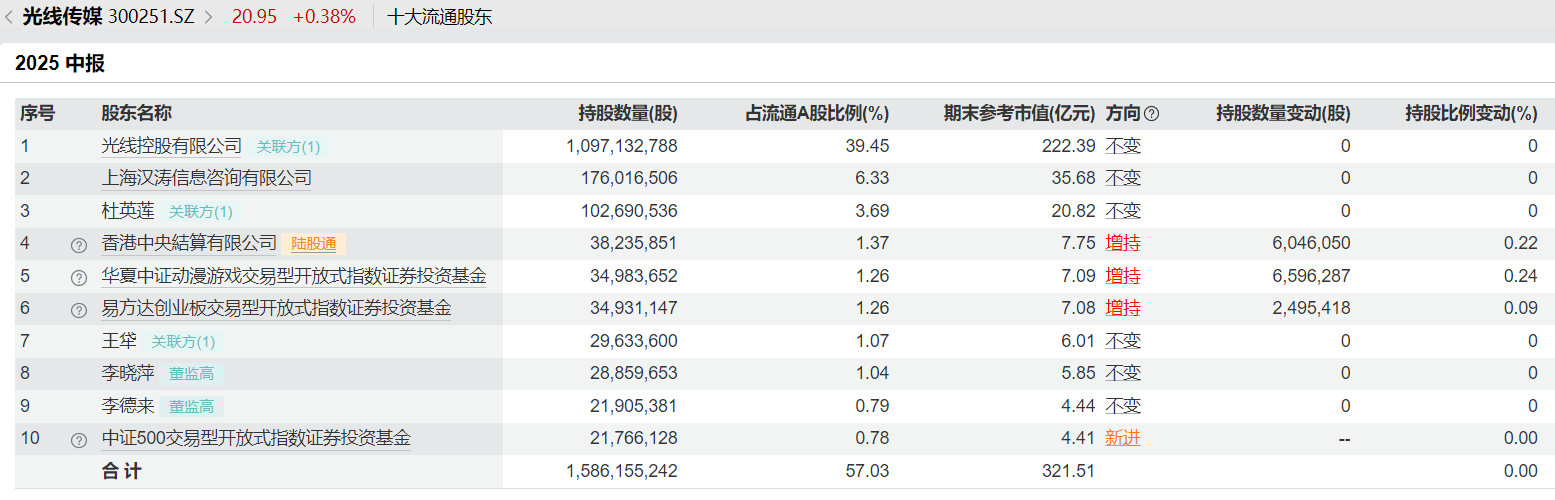 在电影《哪吒2》助推下,光线传媒上半年营收净利均创历史新高。 8月26日晚间,北京光线传媒股份有限公司(光线传媒,300251.SZ)发布2025年半年度报告,上半年公司实现营业收入32.42亿元,同比增长143%;归属于上市公司股东的净利润为22.29亿元,同比增长371.55%。公司计划不派发现金红利,不送红股,不以公积金转增股本。对于营收增长,半年报解释称,主要是本报告期公司影视剧收入增加所致。 ![]() 其中,第二季度,公司实现营业收入2.67亿元,同比增长1.44%;归母净利润为2.14亿元,同比增长343.09%。 据Wind数据,上半年光线传媒营收和净利润均创历史新高,且均超2024年全年业绩。上半年22.29亿元的净利润接近过去7年净利之和(22.97亿元)。 ![]() 光线传媒近年来业绩表现,来自Wind数据 据半年报,光线传媒业务以影视项目的投资、制作、发行为主,主要产品为影视作品及相关衍生内容,业务已覆盖电影、电视剧(网剧)、动漫、IP 运营、音乐、文学、艺人经纪、实景娱乐、产业投资等领域。公司电影及相关衍生业务上半年营业收入31.02亿元,同比增长218.54%,毛利率为80.03%。以此计算,电影及相关衍生业务在公司总营收中占比95.68%。 ![]() 具体来看,电影业务方面,上半年,公司电影及衍生业务的营收和利润均实现大幅增长。公司参与投资、发行并计入报告期内票房的影片包括《哪吒之魔童闹海》(简称“《哪吒2》”)、《独一无二》等,2024年上映并有部分票房结转到报告期的影片包括《小倩》,截至报告期末总票房约为154.63亿元。此外,电影《花漾少女杀人事件》《东极岛》已分别于2025年7月18日、8月8日上映;公司尚储备有《“小”人物》《她的小梨涡》《透明侠侣》《墨多多谜境冒险》《莫尔道嘎》《四十四个涩柿子》等真人电影项目待择机上映。 电视剧/网剧业务方面,报告期内,古装武侠剧《山河枕》正处于后期精修阶段,有望于年内播出;公司正在重点推进《春日宴》的前期策划工作。 动漫业务方面,报告期内,动画电影《哪吒2》已于2025年1月29日在中国大陆上映,于8月2日在中国大陆地区全网上线;已定档45个国家及地区,43个国家及地区已上映,其中15个国家及地区破票房纪录。英文配音版已于8月22日起陆续登陆美国、加拿大、澳大利亚及新西兰影院;日文配音版也在筹备中并将在日本长线放映,放映时间将长达数年。 此外,《非人哉:限时玩家》已于2025年8月16日上映;《三国的星空》已定档于10月1日上映。 此外,公司在推进中的动画项目数量众多,《去你的岛》《罗刹海市》《大鱼海棠 2》《相思》《朔风》《外婆,我的耳朵里有条鱼》在制作中,《涿鹿》《姜子牙 2》《茶啊二中 2》《昨日青空 2》《大鱼海棠 3》《八仙过大海》《大理寺日志》《妲己》《二郎神》《陆判》等动画电影项目在推进中。同时,光线动画制作团队的人数已经超过170人,有可能在明后年扩充到 300 人以上,预计可以达到一年生产一部半到两部的高质量动画电影的生产能力,能够为公司“神话宇宙”系列作品的持续生产提供稳定保障。 需要指出的是,半年报特别提及,公司正处于从“高端内容提供商”向“IP的创造者和运营商”转型的过程中,IP运营业务正在成为公司业绩的新亮点和持续增长点。 公司上半年的衍生品业务主要围绕“哪吒”这一IP展开,覆盖超过30个品类、500多个产品。除了将“哪吒”IP的运营日常化之外,其他如“大鱼海棠”“张缤智和王焕君”等IP的运营工作也已经展开。在渠道方面,公司已为线上电商渠道的试运营开始筹备工作,首批货品的设计将由内部团队主导,旨在打造标杆产品。此外,公司多个IP的快闪店目前正在选址及前期筹备中;首家线下品牌旗舰店也预计于明年年内开业。 游戏业务方面,公司已与相关合作方共同组建游戏公司,目前团队规模超过50人,第一款3A游戏已在制作过程中。卡牌业务方面,已根据不同IP的特点及阶段,规划不同的运营方案并具体推进中。主题乐园方面,经过前期多轮的沟通与磋商,目前公司已在和几个重点地区进一步展开深入洽谈。 据半年报披露,光线传媒前五大股东分别为光线控股有限公司、上海汉涛信息咨询有限公司、李晓萍、杜英莲、李德来,持股比例依次为37.40%、6.00%、3.94%、3.50%、2.99%。其中,杜英莲与光线控股有限公司董事长、公司实际控制人王长田为夫妻关系。从前十大流通股股东变化情况来看,期内3股东增持,1股东新进。其中,香港中央结算有限公司增持604.61万股,占流通A股比例升至1.37%;华夏中证动漫游戏ETF增持659.63万股,占流通A股比例升至1.26%;易方达创业板ETF增持249.54万股,占流通A股比例升至1.26%;中证500ETF为新进股东,占流通A股比例为0.78%。 ![]() 值得一提的是,在《哪吒2》 的票房推动下,光线传媒今年一季度归母净利润为20.16亿元,同比大幅增长374.79%。一季度的净利润更是超过2024年全年营收。据灯塔专业版,截至6月30日21时,《哪吒2》以154.46亿元(中国大陆票房)获得2025上半年票房冠军,《哪吒2》的全球票房为159.11亿元。从1月29日(正月初一)上映,到6月30日23时59分,密钥到期,从影院下映,前后历时153天,达成的主要成就包括:中国影史票房榜冠军、中国影史观影人次冠军、全球影史票房榜第5位、全球影史动画片票房榜冠军。 4月23日,光线传媒披露的投资者关系活动记录表中,光线传媒创始人、董事长王长田回应了《哪吒2》对行业发展