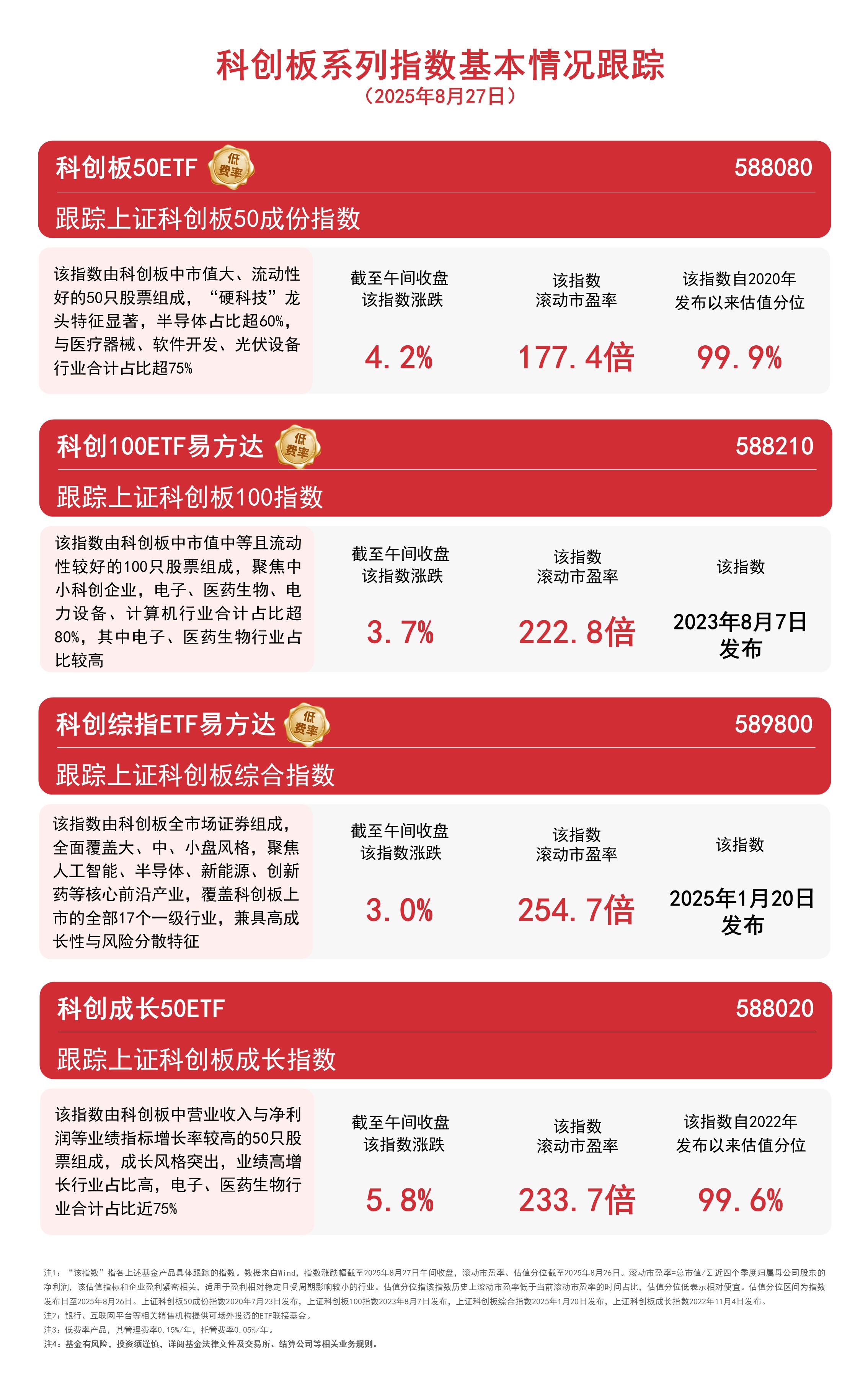 截至午间收盘,上证科创板成长指数上涨5.8%,上证科创板50成份指数上涨4.2%,科创100指数上涨3.7%,科创综指上涨3%,科创板50ETF(588080)半日成交额超30亿元。