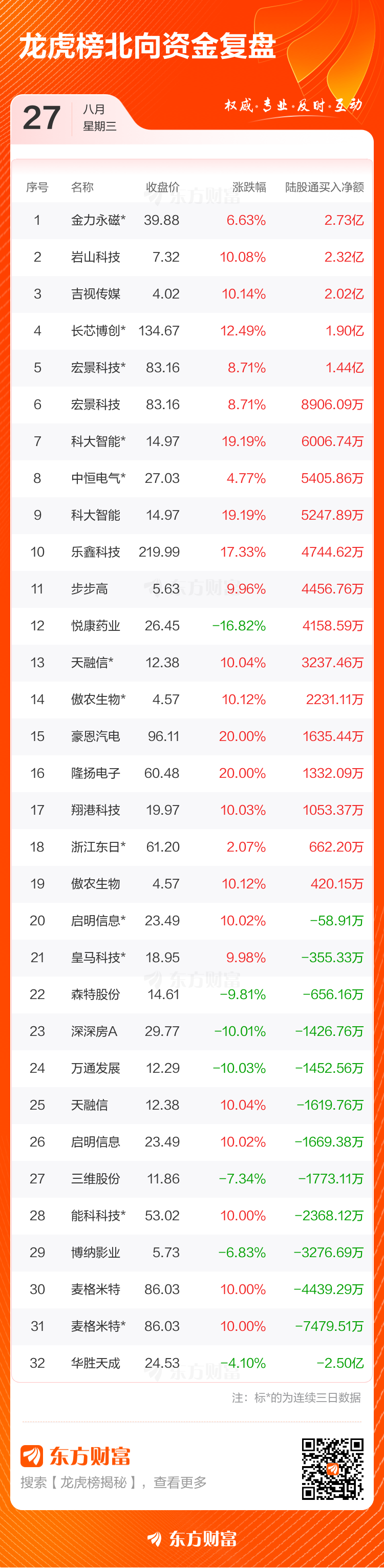8月27日共有70只个股(含1只可转债)上榜龙虎榜,总上榜成交额210.92亿元。上榜个股中净买入额最高的是长芯博创,金额为5.99亿元。 ![]() 当天,游资席位净买入金额最高的个股是万通发展,“章盟主”净买入2.27亿元。 ![]() ![]() ![]() 免责声明:本文基于AI生产,仅供参考,不构成任何投资建议,据此操作风险自担。 (文章来源:东方财富研究中心) |