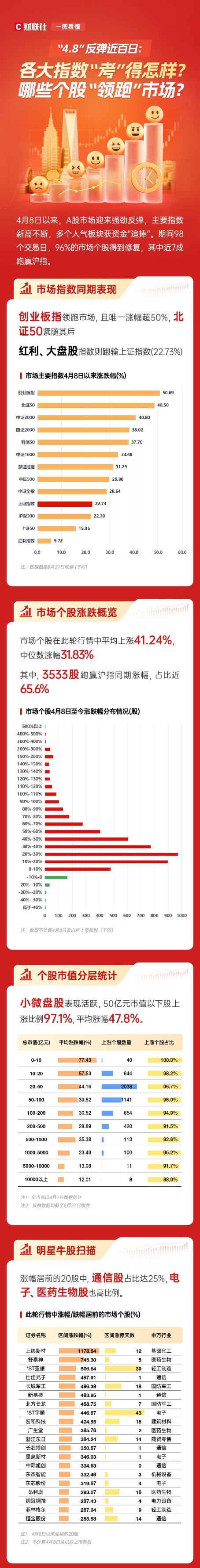 自4月8日以来,主要指数均迎来明显反弹,其中,创业板指以50.7%的区间涨幅领跑。市场个股在此轮行情中平均上涨41.2%,中位数涨幅31.8%,其中,65.6%的个股跑赢沪指同期涨幅(22.7%)。小微盘股持续活跃,50亿元 ...