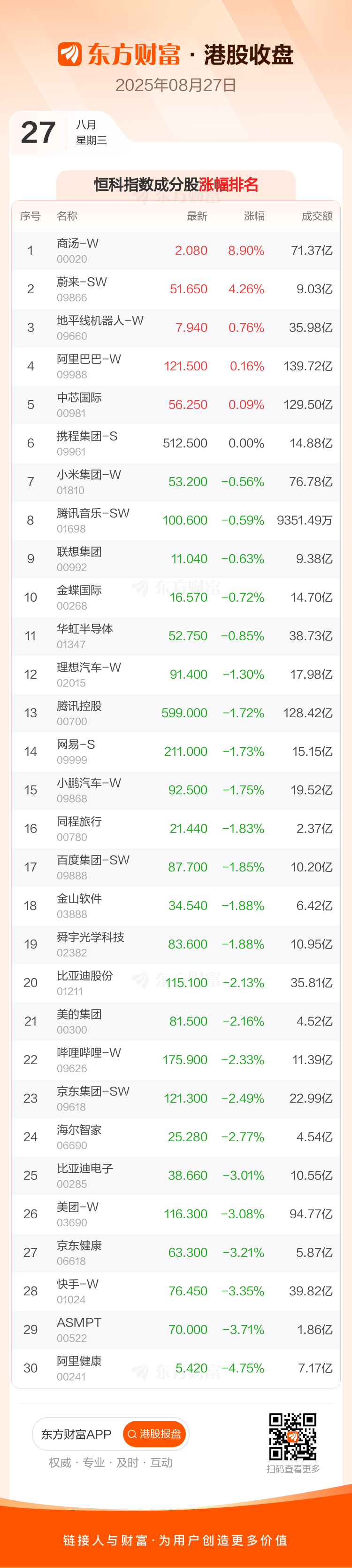 港股8月27日收盘走低,恒生指数收报25201.76点,跌323.16点,跌幅1.27%;恒生科技指数收报5697.53点,跌84.71点,跌幅1.47%。恒生指数成分股中农夫山泉、中升控股、中国宏桥涨幅居前,华润万象生活、石药集团、 ...