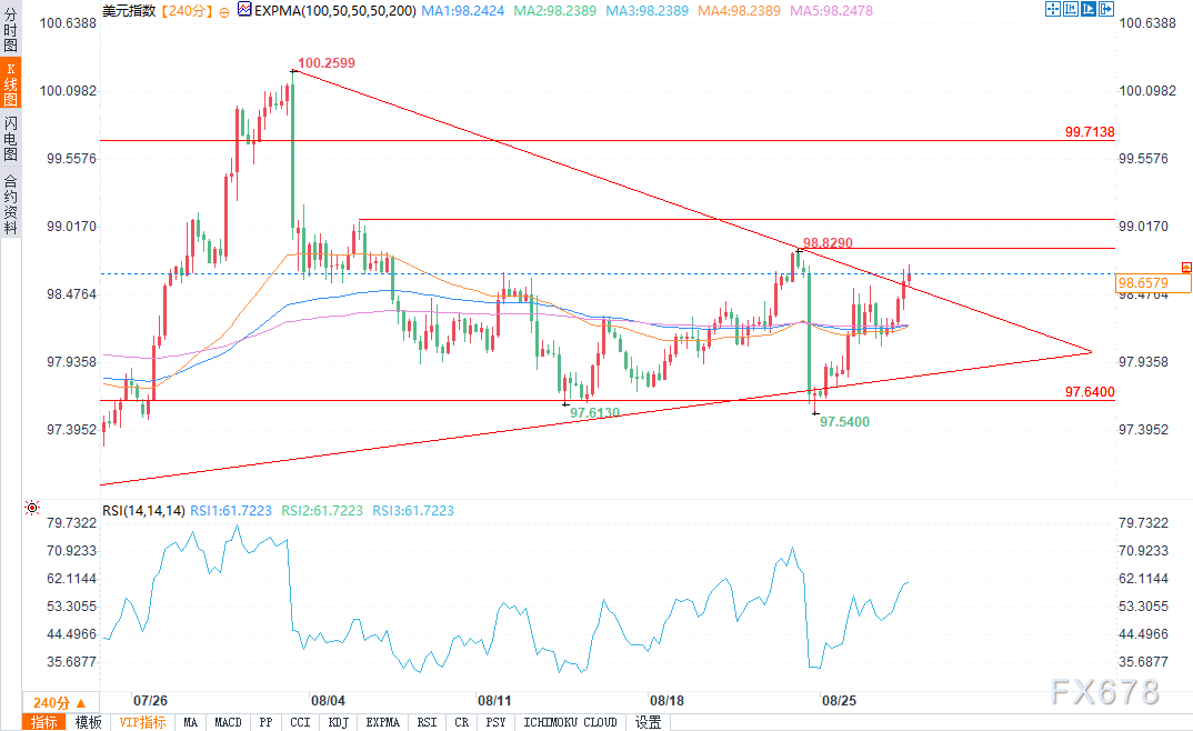 周三 8月27日 欧盘时段 美元指数 DXY 目前交投于98 62附近 盘中上涨约0 42 在近期回调后展现出韧性 市场正消化好于预期的美国经济数据 包括消费者信心指数和耐用品订单数据 这些数据为美元的稳定性提供了支撑 美联 ...