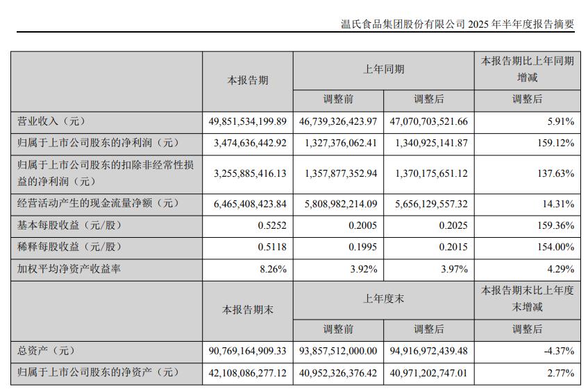 温氏股份发布半年报,上半年营业收入498.52亿元,同比增长5.91%;归属于母公司所有者的净利润34.75亿元,同比增长159.12%;基本每股收益0.5252元,同比增长159.36%。第二季度营业收入255.34亿元,同比增长1.21% ...