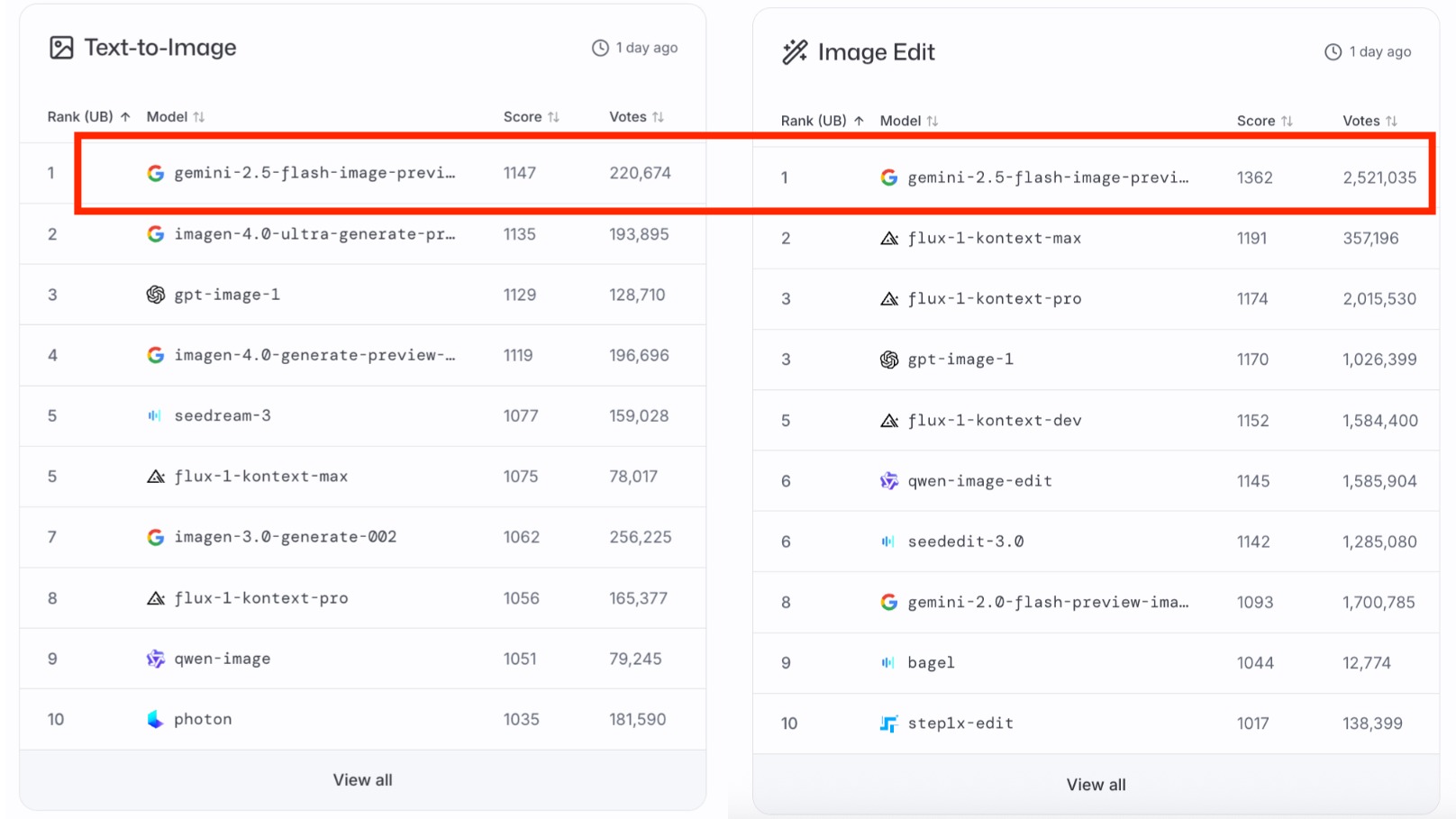 在视频生成模型称霸多个榜单之后,谷歌终于将战火引至图像领域。当地时间8月26日,谷歌发布了其最新的图像生成和编辑模型Gemini 2.5 Flash Image,并迅速登顶多个主流图像排行榜,成为新晋性能冠军。 第一财 ...