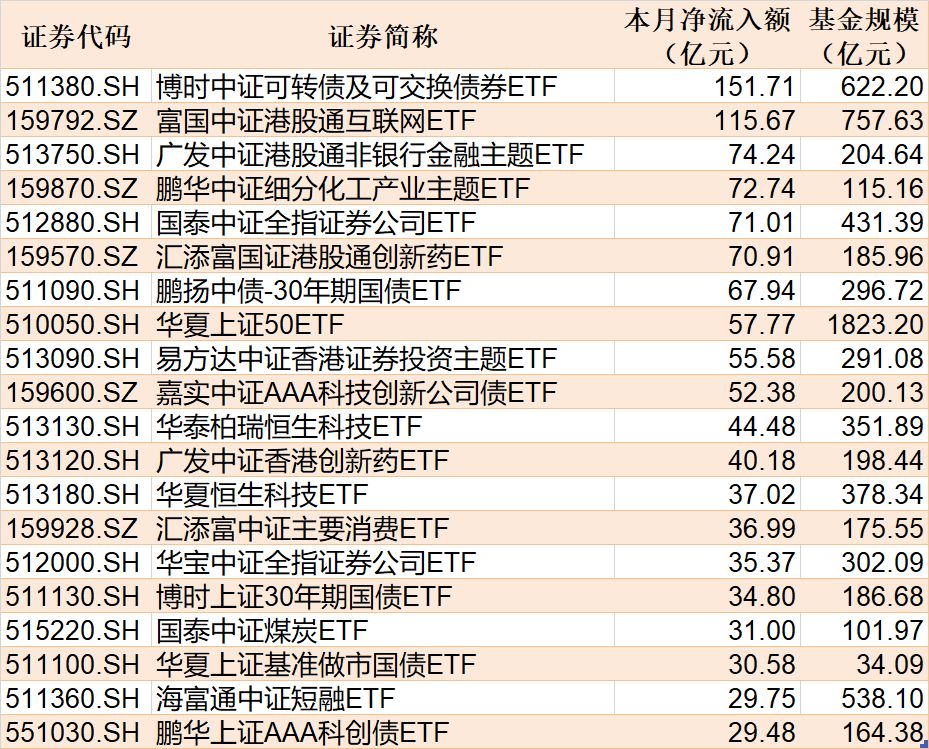 与此同时,华夏上证科创板50ETF份额减少21.87亿份,净流出额29.88亿元;易方达创业板ETF份额减少9.91亿份,净流出额27.24亿元;易方达上证科创板50ETF份额减少16.38亿份,净流出额21.83亿元。 截至8月27日,8月资金净流入额居前20的ETF名单如下: 总体看来,Wind数据显示,8月27日全市场ETF份额为28222.65亿份,总规模为50083.58亿元。份额增加最大的行业为金融,有24只基金跟踪。份额增加最大的主题为中证细分化工产业,有4只基金跟踪。份额增加最大的指数标的为细分化工,有4只基金跟踪;收益最高的指数标的为人工智能(+2.95%),有1只基金跟踪。 封面图片来源:每日经济新闻 |