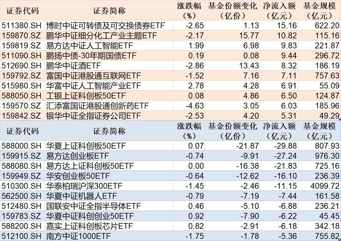 每经记者|叶峰 每经编辑|彭水萍 昨日市场午后跳水回落,沪指、深成指双双跌超1%。从板块来看,CPO等算力硬件股维持强势,芯片股一度冲高,稀土永磁概念股表现活跃。下跌方面,地产股展开调整。 Wind数据显示,在8月27日的非货币ETF市场中,博时中证可转债及可交换债券ETF份额增加1.13亿份,净流入额15.16亿元;鹏华中证细分化工产业主题ETF份额增加15.77亿份,净流入额10.82亿元;易方达中证人工智能ETF份额增加6.98亿份,净流入额9.83亿元。