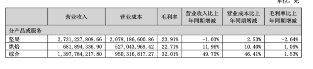 三只松鼠上半年营收同比增长,归母净利润同比下降超五成。 8月27日晚,三只松鼠(300783.SZ)发布2025年半年度报告,营业收入54.78亿元,同比增长7.94%;归母净利润1.38亿元,同比减少52.22%。 ![]() 三只松鼠在财报中表示,营收变动原因有三个,一是2025年年货节前移致一季度营收错档,二季度依托“D+N”全渠道体系,整体营收增速超20%;二是线下分销重点推进日销品铺市并试水乳饮饮料,二季度渠道销售实现翻倍增长;三是洞察即时零售新机遇,探索打造自有品牌生活馆首店。 关于利润变动的原因,三只松鼠则归纳为四个方面,一是坚果原料成本上涨,影响毛利率;二是部分线上平台流量结构变化,费率有所提升;三是线下分销加大市场费用投入,加速日销品布局及终端渗透;四是新增物业折旧及摊销费用上升。 财报显示,今年上半年三只松鼠销售费用增长25.11%至11.19亿元,管理费用增长57.89%至1.56亿元。从产品毛利率来看,坚果类产品毛利率下滑2.64%至23.91%。 三只松鼠认为,2025年,进入更加“卷”的存量竞争时刻后,叠加上半年休闲食品行业传统销售淡季,从行业已发布的半年度业绩报告看,大部分企业承压明显。相对而言,三只松鼠保住了营收增长,利润虽受坚果原料成本上涨和外部环境影响短期波动,但在扩渠道、新品牌孵化、供应链建设等相关动作方面稳步前进,企业内在成长潜能依旧充足。 分产品或服务来看,上半年,三只松鼠的坚果产品营收为27.31亿元,同比下降1.03%;烘焙产品营收6.82亿元,同比增长11.96%;“综合”营收为13.98亿元,同比增长49.70%。 ![]() 三只松鼠表示,为进一步落实总成本领先,提升坚果及零食自产比例,三只松鼠在东区(安徽芜湖)、北区(天津武清)、西南区(四川成都)供应链集约基地基础上,报告期内新增签约华南(广东佛山)供应链集约基地,扩展建设华东供应链集约基地南陵零食产业园。 分品牌来看,三只松鼠营收49.78亿元,占总营收的九成。定位儿童高端健康零食品牌的小鹿蓝蓝,报告期内实现持续增长并盈利,小鹿蓝蓝营收4.37亿元,占总营收的7.97%。小鹿蓝蓝还推出了小鹿蓝蓝care和小鹿蓝蓝plus两大子品牌,分别定位优质基础款母婴用品和青年健康零食潮品牌,逐步进入“婴童食品全领域”并以东南亚市场为试点探索出海业务。 ![]() 报告期内,三只松鼠第三方电商平台营业收入为42.95亿元,占总营收的78.42%。截至报告期末,三只松鼠有2140家经销商。 据灼识咨询数据,2024年中国零食市场规模已接近1.4万亿元人民币,比上年增长5.3%,2019年至2024年间年复合增长率为4.4%。预计到2025年,中国零食市场将继续增长,规模有望突破1.4万亿元人民币。 据大智慧VIP,截至27日收盘,三只松鼠涨1.44%,报28.18元/股,总市值113.19亿元。
