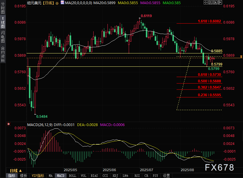 纽元兑美元周四(8月28日)亚市早盘时段于0.5860附近窄幅震荡,对比前一交易日收盘价基本持平。由于美国总统特朗普本周二宣布因抵押贷款违规问题解除美联储理事丽莎·库克的职务,市场对美联储独立性的担忧可能令美元承压,市场静候周四晚间美国GDP修正值表现。美元指数(DXY)报98.14,微跌0.03%。 ![]() 交易员持续评估特朗普解雇库克之举。周二特朗普称,其提名的候选人将很快在美联储理事会占据“多数席位”,这些成员会支持其降息意愿。与此同时,纽约联储主席威廉姆斯周三强调美联储独立性的重要性,此前特朗普试图干预货币政策,对美联储独立性的担忧短期内可能使美元相对于纽元走弱。 另一方面,由于新西兰联储上周三下调政策利率并暗示未来数月将进一步降息(政策制定者警告称国内及全球经济增长面临阻力),纽元上行空间可能受限。新西兰联储主席霍克斯比指出,政策前景取决于数据表现,不过他进一步表示,若企业和消费者保持谨慎且需要更多支持,这可能促使新西兰联储采取更多行动。 后市展望,美国二季度GDP修正值将于周四晚些时候公布。预计美国第二季度经济年化增长率为3.1%。同日还将公布每周初请失业金人数和成屋签约销售数据。 技术分析 纽元兑美元持稳于0.5860附近。MACD动能指标低于信号线,显示看跌动能仍存,RSI明显低于中线水准,暗示上涨动能可能有限。 下行方面,近期低点0.5800附近构成强心理支撑位,若能有效跌破,可能下探0.5730(61.8%斐波那契回撤位)。 上行方面,近三个月低点0.5885附近构成强阻力位,若能有效突破,则可能上探20日简单移动平均线(SMA)(0.5899)。 ![]() ![]() |