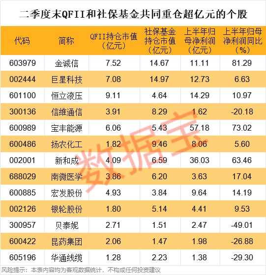 QFII二季度末最新持仓市值超610亿元。 QFII新进重仓33股超亿元 半年报披露接近尾声,各大机构持股纷纷出炉。其中,作为外资主力,QFII持股值得关注。 据证券时报·数据宝统计,截至8月28日,有850只个股半年报前十大流通股东出现QFII,合计持有42.43亿股,期末持仓市值617.68亿元。 以行业持仓统计,电子高居榜首,QFII持仓市值达到146.46亿元,是唯一超百亿元的行业;机械设备、有色金属QFII持仓市值均超50亿元,分别为54.69亿元和52.96亿元;汽车、电力设备、医药生物、基础化工等QFII持仓市值均超40亿元。 从个股来看,目前有5股QFII持仓超10亿元,分别为生益科技、紫金矿业、京东方A、九号公司-WD、东方雨虹。 其中生益科技QFII持仓市值达到95.5亿元,二季度公司股价涨幅超13%,带动持仓市值上涨,但QFII持股反而下降,由一季度末的3.2677亿股下降至二季度末的3.1676亿股。 紫金矿业、京东方A、九号公司-WD的QFII持股在二季度均有提升,例如九号公司-WD,二季度阿布扎比投资局进行加仓操作,施罗德基金(香港)则新进前十大流通股东。 ![]() 从QFII新进或加仓股统计,二季度QFII新进471股,加仓217股。新进股中,江淮汽车、乖宝宠物、新和成、长电科技、成飞集成等33股期末持仓市值超1亿元。 其中江淮汽车QFII持仓市值最高,达到6.75亿元,二季度瑞银集团新进,持仓1683.45万股。乖宝宠物、新和成QFII新进持仓超4亿元,乖宝宠物有两家QFII新进,新和成则获得摩根士丹利新进。 ![]() 期末持仓市值超1亿元的QFII加仓股中,*ST汇科、海辰药业、中力股份、优博讯、锦鸡股份等持仓量翻倍。 其中*ST汇科QFII持股量暴增超37倍,期末持仓市值1.36亿元,二季度有5家QFII扎堆新进,包括高盛国际、摩根士丹利、美林国际、瑞银集团、J.P.摩根。*ST汇科在今年二季度被实施“退市风险警示”“其他风险警示”,今年8月,淄博市财政局否决了淄博国投入主公司,控制权变更事项终止。今年内*ST汇科累计跌幅超60%。 ![]() 社保基金与QFII共同重仓13股 值得注意的是,部分个股同时获得QFII和社保基金(含基本养老金,下同)同时持仓。据数据宝统计,合计有31股同时获得上述两者持股。其中,两者期末持股均超1亿元的个股有13只,金诚信、巨星科技两者合计持仓市值超20亿元,恒立液压、信维通信、宝丰能源等两者合计持仓市值超10亿元。 金诚信有3只社保基金持仓,合计持仓市值14.67亿元,同时有2家QFII持仓,合计持仓市值7.52亿元。金诚信主营矿山服务和资源开发,是国内较早“走出去”的矿山服务商之一。上半年公司实现营收同比增长47.82%,其中海外主营业务收入占比78.53%;归母净利润同比增长81.29%。 巨星科技获4只社保基金持仓,合计持仓市值14.97亿元,2家QFII持仓市值7.08亿元。巨星科技是手工具/动力工具的行业龙头之一,公司产品主要销往欧美国家,两个地区的销量占公司营收比超过九成。上半年公司实现营收同比增长4.87%,归母净利润同比增长6.63%,拟向全体股东每10股派现2.5元(含税)。 ![]() (文章来源:证券时报网) |