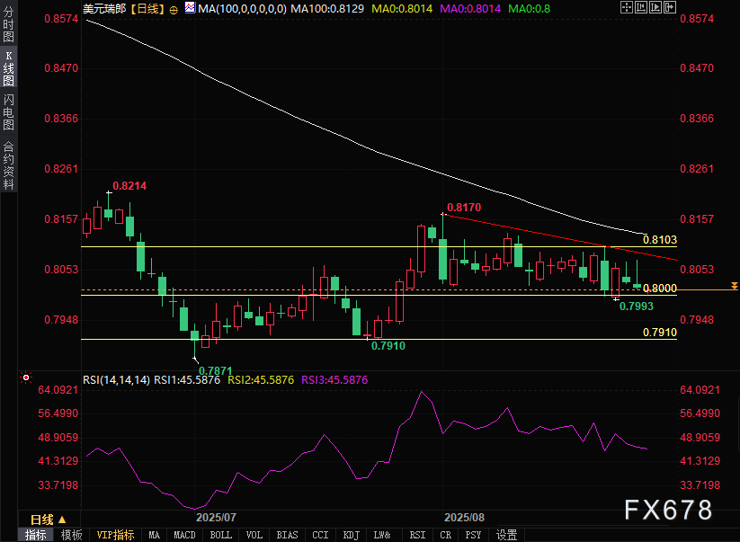 美元兑瑞郎周四(8月28日)欧市时段在0.8000心理关口附近获得支撑,现于0.8015附近窄幅震荡,此前该货币对连续三次均未冲破0.8075,而后从周三0.8075的高点回落,尽管周四公布的瑞士经济数据疲软,但短期看跌趋势仍未改变。 ![]() 此外,衡量瑞士未来经济活动趋势的KOF经济领先指标8月份恶化至97.4,较7月的101.3显著下滑,也低于市场预期的98.0。 美联储降息预期抑制美元反弹动能 美元兑瑞郎本周未能将涨幅扩大至0.8075上方,连续三次冲击均以失败告终,并于周三回落。此前美联储官员威廉姆斯的鸽派言论令美元全线走低。 纽约联储主席约翰·威廉姆斯重申了9月放松货币政策的可能性,他表示每一次美联储会议都是“现场会议”,并暗示下个月降息是一个可信的选项。 然而,美元整体仍处于区间波动状态,投资者正在等待周五公布的PCE物价指数,以寻找美联储下一步政策动向的更多线索。市场普遍预计通胀数据将保持稳定,若结果符合预期,可能会巩固对9月降息的希望,并可能推动美元走低。 技术分析 美元兑瑞郎于0.8015附近窄幅震荡,受近期下降趋势线压制明显,暗示短期看跌格局,此外,RSI明显低于中线位置,表明看跌势能强劲。 上行方面,阻力位看0.8100附近近期高点。值得注意的是,总体仍处于100日移动平均线(MA)(0.8129)下方,表明看跌趋势不容乐观。 下行方面,短期初步支撑看0.8000整数心理关口,若有效跌破改支撑位,有望持续下探近期低点(0.7910)。 ![]() 北京时间16:45,美元兑瑞郎交投于0.8012/13。 ![]() |