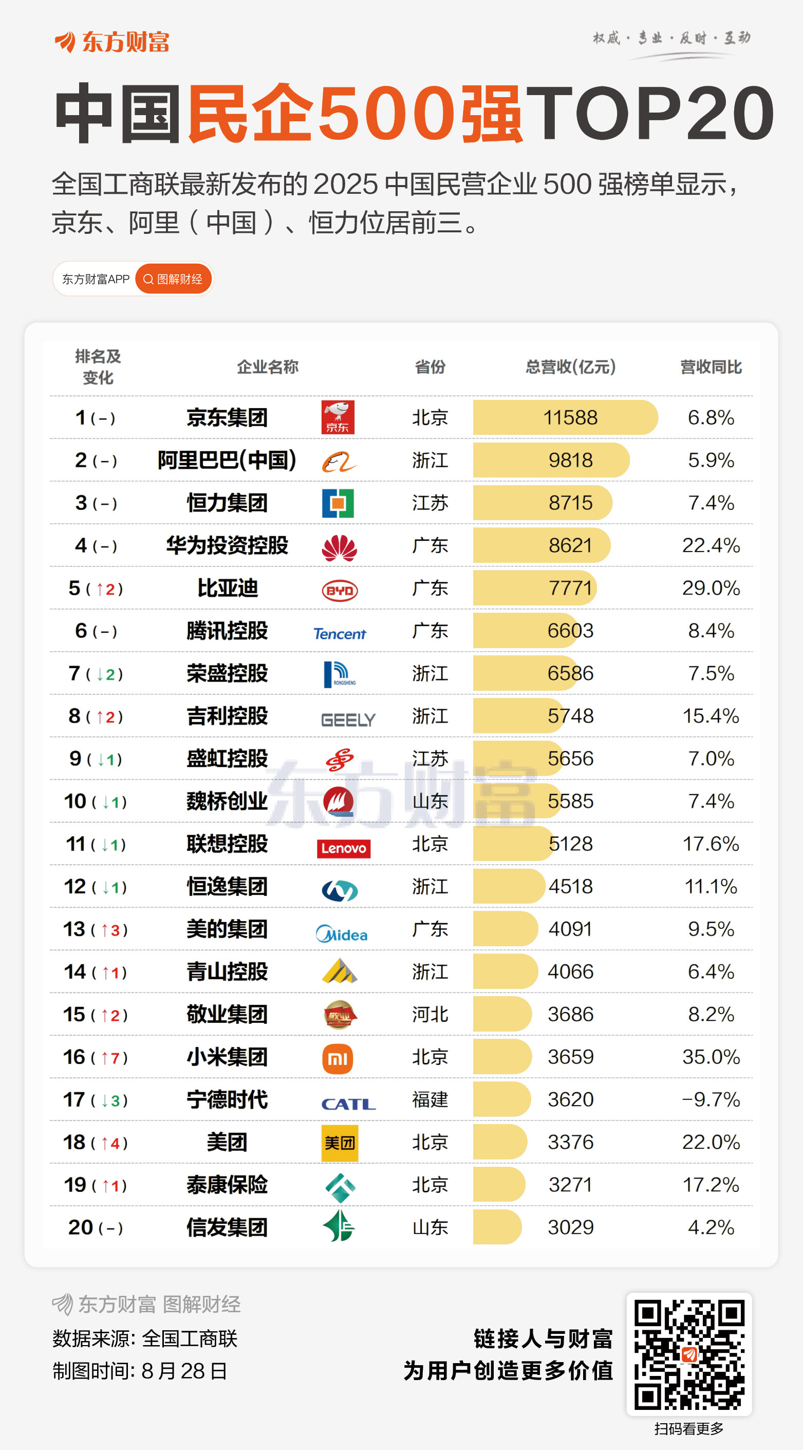 ![]() 全国工商联8月28日公布了2025中国民营企业500强报告。全国工商联表示,今年组织开展了第27次上规模民营企业调研,共有6379家2024年营业收入10亿元以上的企业参加,其中营业收入前500位为2025中国民营企业500强。 具体来看,2025年中国民营企业500强中,京东集团位列第一,营收达11588亿元,也是榜单中唯一营收破万亿的企业;阿里巴巴(中国)第二,营收接近万亿,为9818亿元;恒力集团和华为分别位列第三、第四,营收均超8600亿元。 从排名变化看,榜单前四的企业排名均未发生变化。比亚迪较上年上升了两位至第五,营收为7771亿元,同比增长29%,在榜单前20的企业中,其营收增速仅次于第16名小米集团。小米集团的营收为3659亿元,同比增长35%,排名较上年上升了7位,是榜单前20的企业中排名上升最多的一家。 此外,美团排名上升四位至第十八,为历史上首次进入前20。回溯近年数据可以发现,美团的排名在不断上升。2018年时,美团的营收还只有652亿元,处于榜单百名开外,及至2024年,美团的营收已达3376亿元,六年时间里营收增超2700亿元。 (文章来源:东方财富研究中心) |