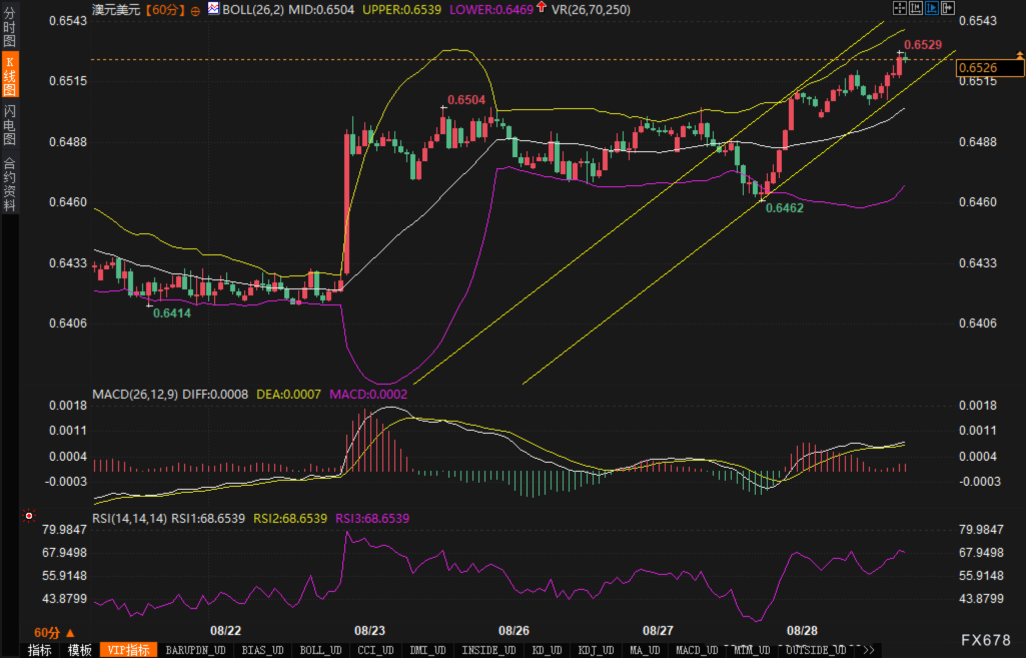 周四(8月28日),澳元/美元一度推升至0.6530一线附近。美元指数DXY回落至97.90附近;CME FedWatch显示9月降息概率约87%。纽约联储主席威廉姆斯表示,为支撑放缓的GDP,某个时点需要降息,但9月决议仍需更多数据验证。市场将于周五迎来7月PCE物价指数。澳洲方面,7月月度CPI同比2.8%,高于2.3%的预期及此前1.9%,使得市场对澳洲联储在9月下旬再度降息的押注降温。上述组合催化,使汇价延续拉升。 ![]() 本轮上行首先来自美元端的系统性回落。随着“软着陆+温和通胀”的叙事转向“增长放缓、需政策缓冲”,美元的利差优势被快速重定价。87%的降息概率将资金久期推向更长端,美元收益率曲线的“实际利差”收窄,触发多头减仓与空头回补的量能前导。同时,周五PCE作为美联储偏好的通胀口径,成为短线波动率的核心定时器,数据前的风险管理驱动美元先行降温。 澳洲端则提供“相对支撑”。2.8%的CPI同比读数打破此前的温和轨迹,澳洲联储的“继续观察”倾向得到强化,削弱了“急切降息”的市场共识。利差与政策路径的相对稳定,使得澳元在美元走弱的背景下具有动量投资属性。此外,大宗商品整体韧性也改善了澳元的流动性与风险偏好定价,汇价获得“内外共振”的推动。 技术面: 1小时K线显示,汇价沿上升通道运行,最新价位0.6526—0.6529区间,逼近通道上轨。布林带上轨0.6539,中轨0.6504,下轨0.6469,带宽温和扩张,体现“趋势延续而非极端扩散”。价格自0.6462的回撤低点再度上攻,期间完成对布林中轨0.6504的二次回测与站稳,趋势线得到验证。 ![]() 关键价位:阻力—0.6539(布林上轨)、0.6545(图示上沿刻度与通道压力汇合);支撑—0.6504(布林中轨/回测位)、0.6488(短支撑)、0.6469(布林下轨)、0.6462(回撤低点/结构性支撑)、0.6414(更低平台)。只要0.6504不失守,上升趋势主线不变;跌破则意味着进入回撤—回测阶段,需观察0.6488/0.6469的吸筹能力与量价配合。 市场情绪观察 从群体心理与市场情绪维度看,本轮上行更多体现为“美元空头与澳元顺势多头的双向强化”。降息预期将“恐惧与贪婪”的摆锤推向多头市场情绪,资金偏向趋势交易与动量跟随。但在PCE公布前,事件风险促使部分中短线资金采取“先涨后锁”的仓位管理,这会在高位制造间歇性的振荡—洗盘,使得1小时级别的RSI容易在70上下反复。期权端的被动对冲可能放大短线挤压,一旦上破0.6539未能放量确认,易出现假突破与小级别“冲高回落”的十字星形态。整体而言,情绪并未过热,但波动率确实因数据而抬升,交易员对滑点与止损触发的阈值更为敏感。 后市展望: 短线(1–3日): 多头路径:若汇价能够在0.6504之上收出连续阳线并有效上破0.6539/0.6545,通道上沿将被量能突破,价格有望在上升通道内继续“台阶式”走高。届时,MACD柱状图应同步放大,RSI短暂越过70属正常的趋势加速现象,随后可能以“回测0.6530—0.6539区间”为确认动作。 空头路径:若0.6539—0.6545压力带多次受阻且伴随RSI顶背离,则倾向演绎为回撤,先看0.6504中轨支撑;失守将指向0.6488与0.6469,跌破0.6462方构成对小时级上升结构的破坏,届时MACD恐转为死叉并回到零轴下方,短线趋势切换为盘整—下探。 中线(1–2周): 走势仍取决于政策与数据共振: 若PCE维持温和、降息预期被巩固,同时澳洲联储维持观望或偏中性,澳元/美元的主要趋势有望保持上行通道内的趋势延续。在这种情形下,回撤多以“中轨—上轨之间的均值回归”展开,动量指标与布林带宽度将呈现周期性扩张/收缩的“呼吸节奏”。 若PCE意外抬升、降息押注降温,美元将出现反身性的快速修正,澳元/美元可能测试0.6469—0.6462的静态支撑。只有有效跌破并在回抽不破的条件下,才可确认趋势反转成立,延伸看更下方0.6414的支撑转阻力验证。 ![]() |