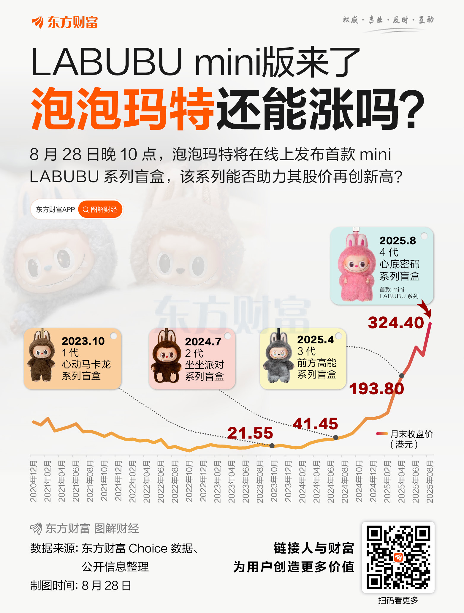 今日(8月28日)晚10点,泡泡玛特将在线上发布首款mini版LABUBU。截至收盘,泡泡玛特报收324.40港元,涨幅0.68%。 该系列名称是THE MONSTERS心底密码系列,属于首款mini版LABUBU盲盒,高10.5CM,区别于第一代 ...