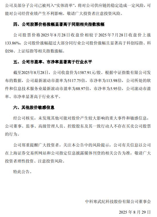 股价新高后,寒武纪最新回应。 寒武纪8月28日晚间发布公告称,公司关注到近期市场上存在部分对公司经营情况的预测,公司结合实际情况,预计2025年全年实现营业收入50亿元至70亿元。 上述经营预测等前瞻性内容,系公司管理层的初步预测,不构成公司对任何投资者的实质承诺。投资者及相关人士均应对此保持足够的风险认识,并且应当理解计划、预测与承诺之间的差异,注意投资风险。 公司未有新产品发布计划,近期网上传播的关于公司新产品情况的信息,均为误导市场的不实信息。 公司采用Fabless模式经营,供应商包括IP授权厂商、服务器厂商、晶圆制造厂和封装测试厂等。由于集成电路整个行业链是专业化分工且技术门槛较高,加之公司及部分子公司已被列入“实体清单”,将对公司供应链的稳定造成一定风险,可能对公司经营业绩产生不利影响。 今日,寒武纪股价高开高走,盘中突破1500元,收盘为1587.91元,全天涨幅达15.73%。值得注意的是,寒武纪今日收盘价超越了贵州茅台的1446.10元,正式成为A股新“股王”。 根据中证指数有限公司发布的数据,寒武纪最新滚动市盈率为5117.75倍,市净率为113.98倍,公司所处的软件和信息技术服务业最新滚动市盈率为88.97倍,市净率为5.95倍,公司滚动市盈率、市净率显著高于行业水平。 8月26日,寒武纪发布半年报显示,上半年营业收入28.81亿元,同比增长4347.82%;归属于母公司所有者的净利润10.38亿元,上年同期净亏损5.3亿元,同比扭亏为盈。 资料显示,寒武纪成立于2016年,专注于人工智能芯片产品的研发与技术创新,致力于打造人工智能领域的核心处理器芯片。 8月21日,DeepSeek在其官宣发布DeepSeek-V3.1的文章中提到,DeepSeek-V3.1使用了UE8M0 FP8 Scale的参数精度;另外,V3.1对分词器及Chat Template进行了较大调整,与DeepSeek-V3存在明显差异;DeepSeek官微在置顶留言里表示,UE8M0 FP8是针对即将发布的下一代国产芯片设计。南方基金认为,此举印证国产芯片设计在自主可控和国产替代的征途上再次迈出强有力一步。 此外,上周OpenAI CEO表示希望在未来投入数万亿美元用于开发和运行AI服务所需的基础设施建设。南方基金表示,此次OpenAI扩容再度印证大模型商用进程加速将直接驱动超大规模训练集群建设需求,而未来国内厂商势必将占据一席之地。 今年以来,以DeepSeek为代表的原生创新企业的成功全面验证了中国科技实力的崛起以及中国教育体系的成功。诺安基金表示,预计未来像这样有潜力“改变世界”的硬核创新,将会如雨后春笋般在中国出现,“这将改变全球市场对于中国科技资产的预期,中国科技资产的估值有望迎来系统性的估值重构”。 浙商证券指出,出口管制倒逼本土创新崛起,中长期看,自主可控仍是主线,政策与应用倾斜将持续利好本土厂商。 中信证券也表示,当前半导体周期仍处于上行通道,其中AI持续强劲,泛工业接棒消费电子也进入复苏阶段。展望未来,AI仍将是半导体产业向上成长的最大驱动力,一方面云端AI需求持续,另一方面终端AI应用有望加速落地,并且中国半导体厂商在后续AI产业发展过程中的受益程度有望显著提升,从上市公司的角度其投资逻辑具体可以分为两条主线,其中云端看国产替代,终端看下游增量。 (文章来源:证券时报) |