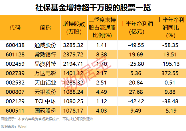 社保基金最新出现在425股前十大流通股东榜。 今日(8月28日),市场午后V形反弹,沪指尾盘涨超1%,创业板指涨超3%,芯片股集体爆发,中芯国际涨超17%创新高; CPO、PCB等算力硬件股全线拉升,农业、医药医疗、酿酒、猪肉等板块下跌。 ![]() 寒武纪-U涨15.73%,最新股价1587.91元/股,股价超越贵州茅台1446.1元/股的收盘价,成为A股新“股王”。公司上半年营业总收入28.81亿元,同比增长4347.82%;归母净利润为10.38亿元。 公司表示,2025年上半年,人工智能算力需求持续增长,公司凭借人工智能芯片产品的核心优势,持续深化与大模型、互联网等前沿领域头部企业的技术合作。公司凭借卓越的产品适配能力和开放合作的务实态度,以技术合作促进应用落地,以应用落地拓展市场规模,营业收入实现了显著增长。 社保基金新进108股 作为风格稳健的长期机构投资者,社保基金持有的重仓股备受市场关注。据证券时报·数据宝统计,截至8月28日收盘,公布半年报公司中,社保基金最新出现在425股前十大流通股东榜。调仓动向方面,二季度社保基金新进108股、增持108股、减持111股,社保基金持股量保持不变的有98股。 社保基金新进的个股中,23股获新进持股均超千万股。 三安光电的新进股数最大,二季度全国社保基金103组合新进持股8000.99万股,持股比例1.6%。中国人保、内蒙华电、华菱钢铁、南极电商、八一钢铁等个股社保基金新进股数居前。 从持股比例来看,新进股中社保基金持有比例最多的是佰奥智能,持股量占流通股比例为7.23%,其次是诺思格,社保基金持股比例为3.8%,持股比例居前的还有中触媒和北鼎股份等。 ![]() 业绩方面,社保基金新进股中,半年报净利润同比扭亏的有高澜股份、新强联、新钢股份、博腾股份。净利润同比增幅最高的是亚香股份,公司半年报归母净利润为1.1亿元,同比增长211.25%。净利润同比增幅居前的还有利尔化学、鼎通科技等。 8股获社保基金增持均超千万股 社保基金增持的个股中,8股获社保基金增持均超千万股。通威股份的增持股数最大,二季度获得社保基金增持3285.32万股,持股比例从一季度末的0.68%上升至1.41%。常熟银行、晶澳科技、万达电影、天山铝业的增持股数居前。 ![]() 从持股比例来看,较一季度末,聚和材料、首药控股-U、国药股份、确成股份、中通客车的社保基金持股比例增加均超1个百分点。 股价表现方面,增持股中,英维克的股价表现最好,二季度以来股价累计上涨165.57%,该股二季度获得社保基金增持298.51万股。沪电股份、好太太、鹏鼎控股、金诚信等个股二季度以来股价涨幅均超50%。 上述8股中,万达电影、常熟银行、云铝股份、天山铝业的上半年业绩实现同比增长。万达电影的净利润同比增幅最高,公司上半年营业总收入66.89亿元,同比增长7.57%,归母净利润为5.36亿元,同比增长372.55%。 (文章来源:数据宝) |