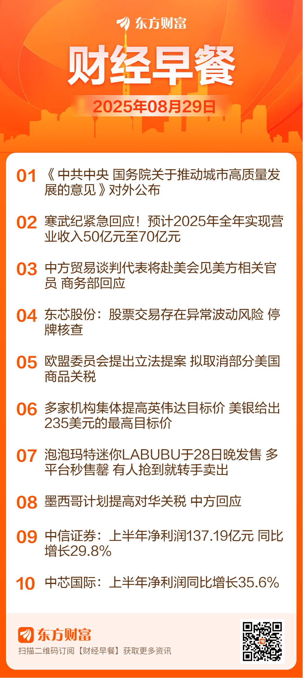 ![]() 每日精选城市高质量发展: 8月28日,《中共中央 国务院关于推动城市高质量发展的意见》对外公布。这份意见强调,城市是现代化建设的重要载体、人民幸福生活的重要空间。我国城镇化正从快速增长期转向稳定发展期,城市发展正从大规模增量扩张阶段转向存量提质增效为主的阶段。这份意见提出,到2030年,现代化人民城市建设取得重要进展,适应城市高质量发展的政策制度不断完善;到2035年,现代化人民城市基本建成。 寒武纪最新公告: 28日晚间,寒武纪发布股票交易风险提示公告称,公司关注到近期市场上存在部分对公司经营情况的预测,公司结合实际情况,预计2025年全年实现营业收入50亿元至70亿元。公告显示,公司未有新产品发布计划,近期网上传播的关于公司新产品情况的信息,均为误导市场的不实信息。公告还提示了公司供应链稳定的风险。公司采用Fabless模式经营,供应商包括IP授权厂商、服务器厂商、晶圆制造厂和封装测试厂等。由于集成电路整个行业链是专业化分工且技术门槛较高,加之公司及部分子公司已被列入“实体清单”,将对公司供应链的稳定造成一定风险,可能对公司经营业绩产生不利影响。 英伟达目标价: 英伟达公布第二季度业绩报告后,多家投行更新其对这家人工智能巨头的最新评级及目标价格。美银将英伟达目标价从220美元上调至235美元;摩根士丹利将英伟达目标价从206美元上调至210美元;花旗银行将英伟达目标价从190美元上调至210美元;摩根大通将英伟达目标价从170美元上调至215美元;伯恩斯坦将英伟达目标价从185美元上调至225美元。 中美经贸: 商务部发言人介绍,商务部国际贸易谈判代表兼副部长李成钢率团于24日至27日访问加拿大,与加方共同主持召开中加经贸联委会,之后李成钢一行将赴美国华盛顿会见美方相关官员。中方愿与美方一道,继续发挥好中美经贸磋商机制作用,通过平等对话协商解决问题,共同维护中美经贸关系健康稳定可持续发展。 中国民营企业五百强发布: 全国工商联8月28日公布了2025中国民营企业500强报告,共有6379家2024年营业收入10亿元以上的企业参加,其中营业收入前500位为2025中国民营企业500强。具体来看,2025年中国民营企业500强中,京东集团位列第一,营收达11588亿元,也是榜单中唯一营收破万亿的企业;阿里巴巴(中国)第二,营收接近万亿,为9818亿元;恒力集团和华为分别位列第三、第四,营收均超8600亿元。 东芯股份停牌核查: 东芯股份8月28日公告,公司股票自2025年7月29日以来多次触及股票交易异常波动及严重异常波动情形。为维护投资者利益,公司将就股票交易波动情况进行停牌核查。公司股票将于2025年8月29日开市起停牌,预计停牌时间不超过3个交易日。 墨西哥计划对中国加征关税: 中国外交部发言人郭嘉昆28日主持例行记者会。有记者就墨西哥政府计划提高对华关税一事提问。郭嘉昆:墨西哥是中国在拉美的第二大贸易伙伴,中国是墨西哥第三大出口目的地国,互利共赢是中墨经贸合作的本质特征。中方始终倡导普惠包容的经济全球化,反对各种形式的单边主义、保护主义以及歧视性、排他性措施。 市场竞争秩序规范: 据市场监管总局网站,今日,市场监管总局召开综合整治市场竞争秩序防范非理性竞争部署推进会,会议强调,要深刻认识综合整治市场竞争秩序防范非理性竞争的重大意义,突出问题导向、目标导向、结果导向,坚持系统谋划、整体推进,聚焦重点领域持续加大工作力度,创新工作方式方法,切实防范非理性竞争,维护公平竞争市场秩序。 热点题材房地产: 《中共中央、国务院关于推动城市高质量发展的意见》对外公布。系统推进“好房子”和完整社区建设。加快构建房地产发展新模式,更好满足群众刚性和多样化改善性住房需求。全链条提升住房设计、建造、维护、服务水平,大力推进安全、舒适、绿色、智慧的“好房子”建设。实施物业服务质量提升行动。稳步推进城中村和危旧房改造,支持老旧住房自主更新、原拆原建。 量子科技: 据创新南山公众号,近日,国内量子计算领军企业——北京玻色量子科技有限公司(以下简称“玻色量子”)自建的“专用光量子计算机制造工厂”正式落地深圳南山区。同时,玻色量子在南山智城注册成立“深圳玻色智能制造科技有限公司”和“深圳玻色量子科技有限公司”两家子公司,分别负责相干光量子计算机整机及核心部件的规模化生产任务和相干光量子计算机销售与技术服务。 光刻胶: 据智慧南法信官微,近日,位于顺义区南法信镇HICOOL产业园的北京光引聚合科技有限公司成功突破光刻胶关键技术难题,研发出的BCB光刻胶核心性能达到国际先进水平,并成为国内首家具备吨级量产能力的企业。光刻胶是芯片制造的重要材料,被称为“半导体工业的粮食”。据ICInsights统计,2025年全球半导体光刻胶市场规模预计突破30亿美元,同比增长8%,市场空间广阔。 数据要素: 8月28日,在2025中国国际大数据产业博览会开幕式上,国家数据局局长刘烈宏表示,近期正在部署一批数据产业集聚区建设试点,加快推动形成产业生态和规模优势。他还表示,今年将推出数据产权、数据创新型企业、数字产业集群等十几项产业政策。此前一天,国家数据局会同有关部门召开数字中国建设工作推进会议。会议提出,要加快推进行业高质量数据集建设,积极服