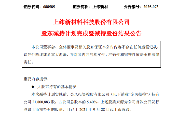 8月28日晚间,上纬新材(688585)公告,当日,公司收到金风投控出具的《关于股份减持计划实施完成的告知函》,截至8月28日,金风投控通过集中竞价方式累计减持公司股份403.36万股,占公司总股本的1%,本次减持计划 ...