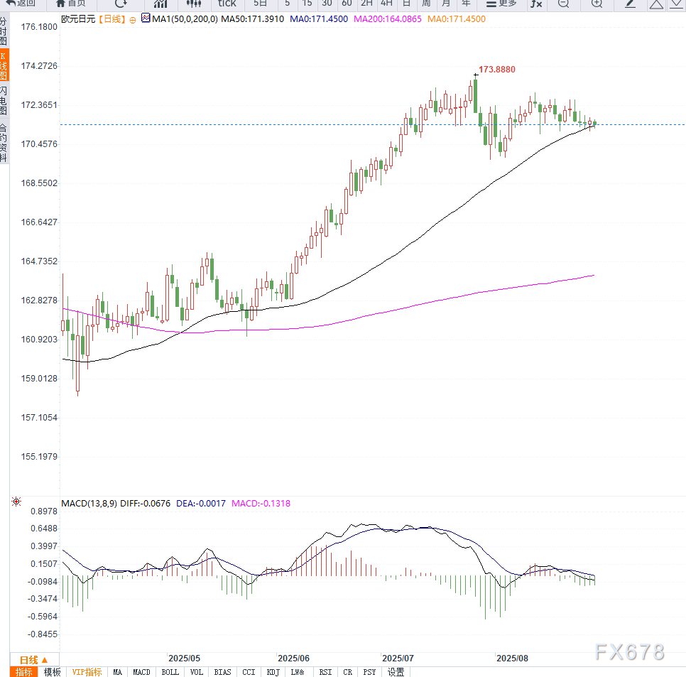 周五欧洲早盘,EUR/JPY汇率下跌至约171.45,欧元对日元走势走弱。德国最新零售销售数据成为欧元承压的主要因素。 ![]() 剔除生鲜的东京CPI同比为3.0%,略低于上月3.1%。这些数据支撑日元走势,同时保持市场对日本央行可能进一步加息的预期。根据8月市场调查,约三分之二的经济学家预测日本央行将再度上调利率25个基点。 市场关注的焦点还包括德国8月CPI初值,以及欧洲央行副行长Luis de Guindos的讲话。这些事件可能在短期内带来欧元波动。技术面上,EUR/JPY在171.45附近短期支撑明显,如跌破该水平,下行压力或加大。 从日线图来看,EUR/JPY近期在171.45附近形成短期支撑区,汇价在此位置多次反弹,但整体上仍处于近期高位回落的整理阶段。 价格自上月高点逐步下行,日K线显示多根带长上影线的阴线,显示上方卖压明显。相对强弱指标(RSI)目前在45附近,仍未进入超卖区域,暗示短线可能继续横盘整理或缓慢下行。 若价格跌破171.45支撑,可能加速回落至170.50-170.20区域;反之,如能企稳并突破172.00阻力位,则短期回升空间或延伸至172.50附近。 ![]() 当前欧元和日元走势呈现“欧元承压、日元支撑”的格局。德国零售销售低于预期显示欧洲经济复苏仍不稳,而东京CPI数据仍高于目标,意味着日本央行加息预期持续。 关注德国CPI初值及欧洲央行政策表态,同时留意技术支撑位171.45的变化。整体来看,短期欧元承压可能延续,日元仍有支撑。 ![]() |