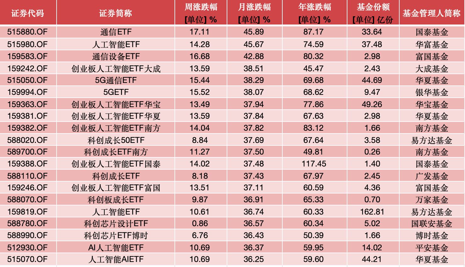 每经记者|曾子建 每经编辑|叶峰 今日是8月最后一个交易日。截至收盘,沪指报收于3857.93点,本月累计上涨7.97%,创业板指数报收于2890.13点,月涨幅达24.13%,科创50指数报收于1341.31点,月涨幅更是高达28%。 而在ETF方面,通信、人工智能、芯片成为最大受益者,多只产品月涨幅超过40%。 月涨幅榜:通信ETF单月涨超45%夺冠 回顾本月行情,1200多只ETF产品大面积上涨,月涨幅中位数超过10%,市场赚钱效应明显提升。 具体来看,本月能够进入涨幅排名前20的产品,月涨幅都超过36%。其中,涨幅最大的是通信ETF(515880),月涨幅高达45.89%;排名第二的是人工智能ETF(515980),月涨幅45.67%;排名第三的是通信设备ETF(159583),月涨幅42.88%。 通信ETF之所以能够在涨幅榜中夺冠,主要是其重仓股中的中际旭创、新易盛以及天孚通信这三家光模块概念股持续上涨。其中,中际旭创月涨幅63%,新易盛月涨幅88%,天孚通信月涨幅也高达87.9%。除此之外,工业富联月涨幅55%,公司跻身万亿市值“俱乐部”。除了上述三只ETF外,多只创业板人工智能ETF涨超37%,这些产品也都重仓了光模块“三驾马车”。 本月还有一个焦点,即寒武纪成为A股新股王。寒武纪的大涨,也带动科创板芯片板块集体大涨。ETF方面,科创成长50ETF、科创成长ETF、科创芯片设计ETF等整体表现强势,月涨幅都超过36%。 值得注意的是,由于寒武纪绝对股价已经超过贵州茅台,同时科创板个股对普通散户投资者存在50万资金量的门槛限制,因此导致很多中小投资者无法直接投资寒武纪。而科创板相关ETF则为中小投资者提供了参与的机会。 除了上述产品外,还有一些产品8月也有不错表现。比如消费电子50ETF,本月涨幅32%;稀土ETF月涨幅29%,储能电池ETF也有27%的月涨幅。 跌幅榜:跷跷板效应明显,红利类ETF持续低迷 再看8月ETF的跌幅榜,A股市场虽然表现强势,但8月以来依旧有超过80只产品出现回落。尽管跌幅榜产品整体跌幅不大,但市场跷跷板效应依旧明显。 具体来看,8月累计跌幅最大的是标普消费ETF,月跌幅达5%,位居跌幅榜之首。该产品今年1月见顶回落,今年以来累计下跌6.89%。此外,去年上市的两只沙特ETF今年也表现不佳,本月均出现一定幅度回落,年内累计下跌超过8%。 A股方面,表现较差的是红利类ETF以及能源化工ETF。其中,能源化工ETF8月下跌3.5%,今年累计下跌超9%,该产品主要投资能源化工领域的商品期货,最近两年连续下跌。 而银行ETF,以及港股通红利ETF,在8月也都表现低迷。这两类产品都属于红利类ETF,在当前整个市场风险偏好较高时,高股息类产品确实就很难有好的表现。 |