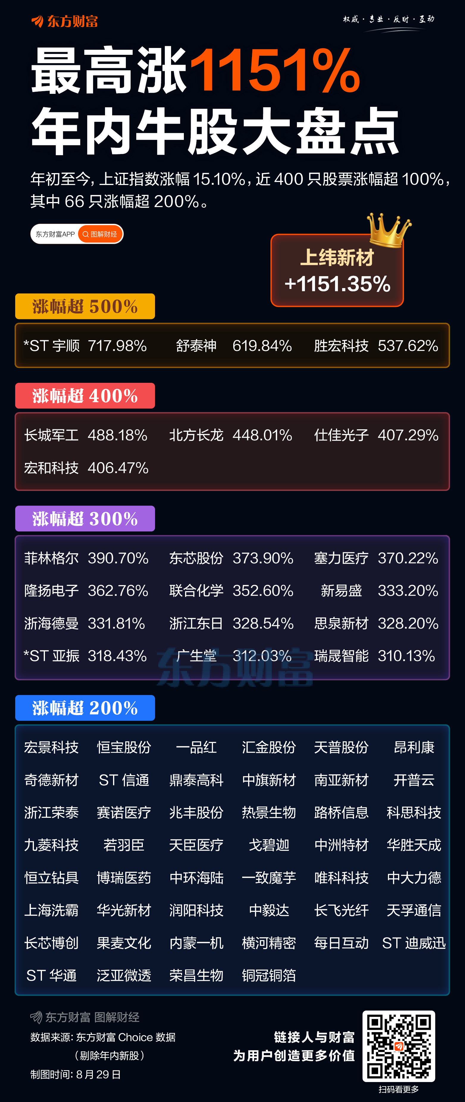 截至今日(8月29日)收盘,上证指数报收3857.93点,年内涨幅达15.10%,全市不含年内新股已有394只股票实现翻倍,其中涨幅超200%的有66只。 东方财富Choice数据显示,年内涨幅最高的是上纬新材,涨幅高达1151. ...