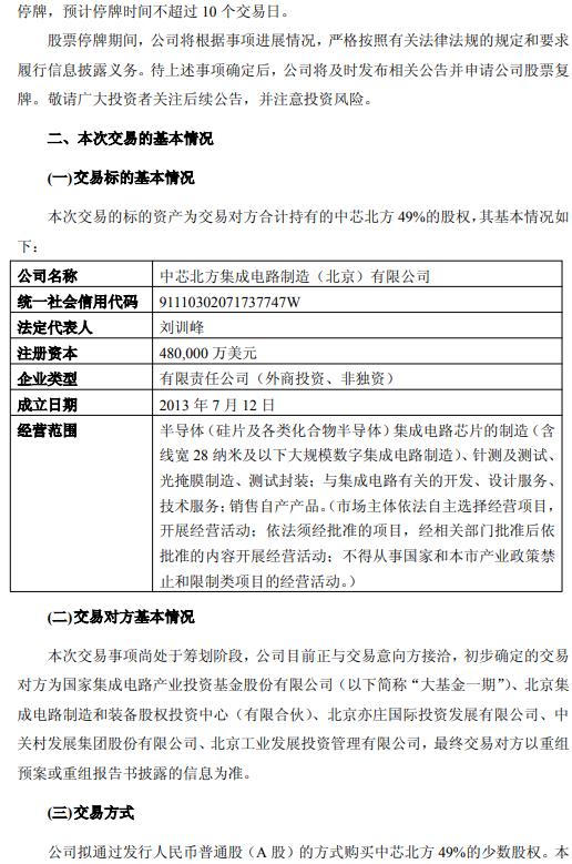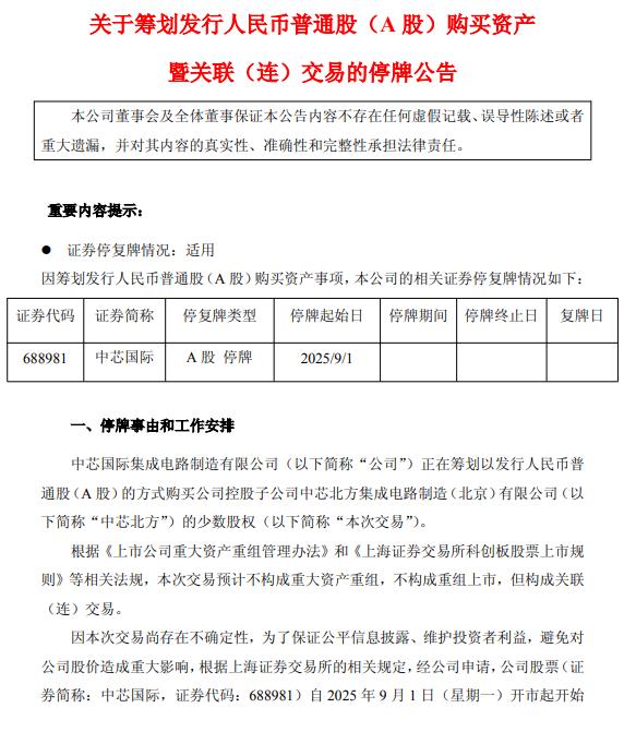 中芯国际公告,公司正在筹划以发行人民币普通股(A股)的方式购买公司控股子公司中芯北方集成电路制造(北京)有限公司的少数股权,公司股票自2025年9月1日开市起开始停牌,预计停牌时间不超过10个交易日。本次 ...