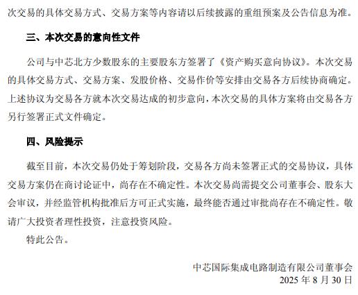 中芯国际公告,公司正在筹划以发行人民币普通股(A股)的方式购买公司控股子公司中芯北方集成电路制造(北京)有限公司的少数股权,公司股票自2025年9月1日开市起开始停牌,预计停牌时间不超过10个交易日。本次交易预计不构成重大资产重组,不构成重组上市,但构成关联(连)交易。公司已与中芯北方少数股东的主要股东方签署《资产购买意向协议》,但具体交易方案仍在商讨论证中,尚存在不确定性。 ![]() ![]() ![]() (文章来源:第一财经) |
