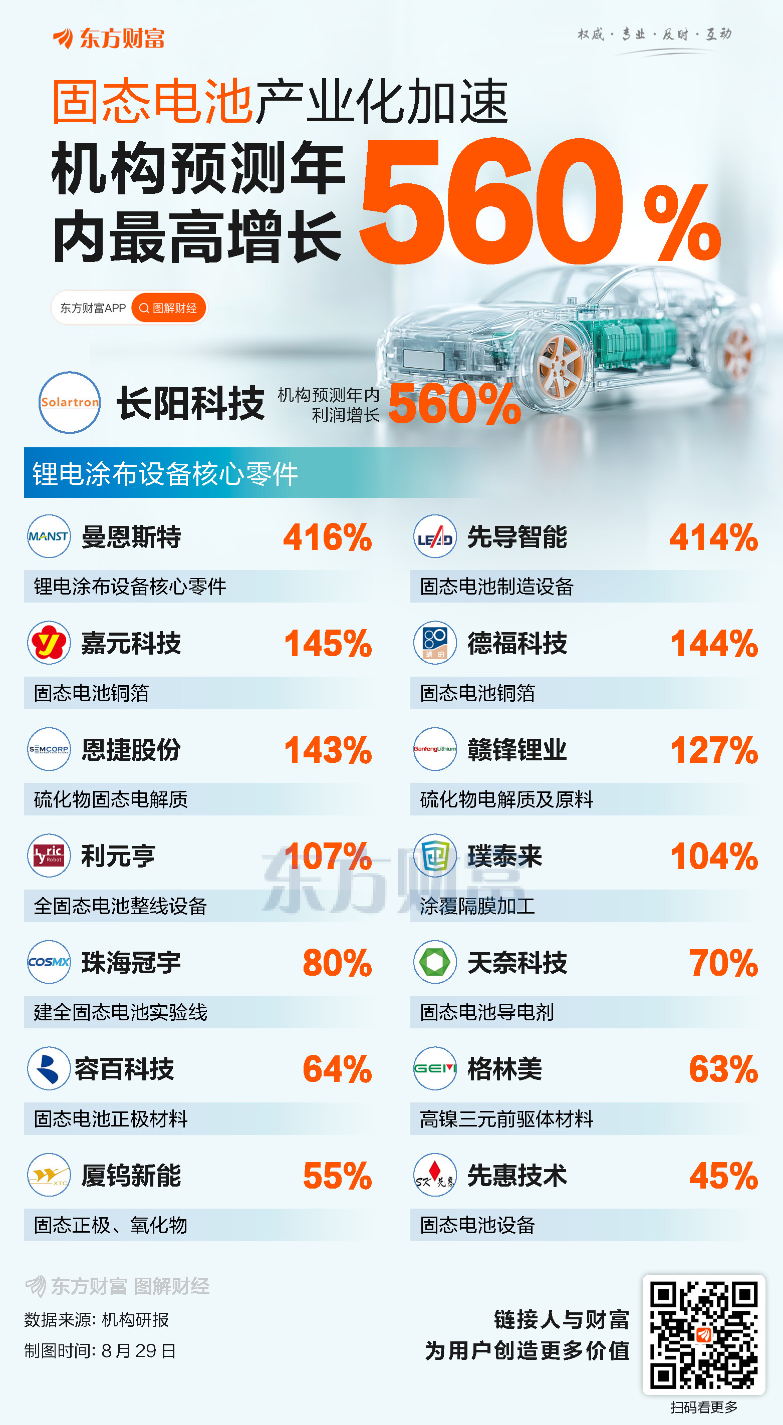 ![]() 周五固态电池概念爆发,先导智能等多股20CM涨停,长阳科技涨超13%,龙头宁德时代涨超10%,璞泰来、国轩高科等涨停,厦钨新能、容百科技等强势跟涨。 综合市场消息面看,产业进程加速、业绩改善等多重因素引发概念板块爆发。 固态电池技术产业化进程加速成为本轮行情的关键催化因素。近日,国轩高科宣布在半固态电池研发及产业化方面取得阶段性进展,并计划推动量产线建设,这一动态被市场视为行业技术迭代的重要信号;先导智能在2025年上半年推进固态电池设备研发,已完成全固态电池量产全工艺环节的打通。 国金证券近期研报显示,当前固态电池产业正呈现加速发展态势,技术突破与商业化进程同步推进,半固态电池已实现规模化装车应用;当前全固态电池向硫化物路线聚焦,以比能量400Wh/kg、循环寿命1000次以上为性能目标。政策与市场双重驱动下,我国固态电池市场预计在eVTOL、人形机器人等新兴领域将迎来需求爆发。 公司业绩改善也为上涨提供动力。先导智能上半年营收同比增长14.92%,净利润大幅上升61.19%,显示出锂电设备企业在订单交付和盈利质量上的修复;又比如宁德时代今年上半年归母净利润为304.85亿元,同比较去年同期上涨33.33%。 随着下游新能源汽车市场“金九银十”传统旺季临近,动力电池需求预期逐渐回暖,储能需求维持高位。市场分析指出,本轮行情不仅体现短期情绪修复,更反映出市场对电池产业中长期发展路径的重新审视。 中信证券表示,看好中国电池核心资产的配置价值。短期,25Q2受供需持续改善影响,电池价格企稳,上游原材料成本下降、稼动率提升带来额外盈利弹性,电池板块业绩有望超预期。 (文章来源:东方财富研究中心) |