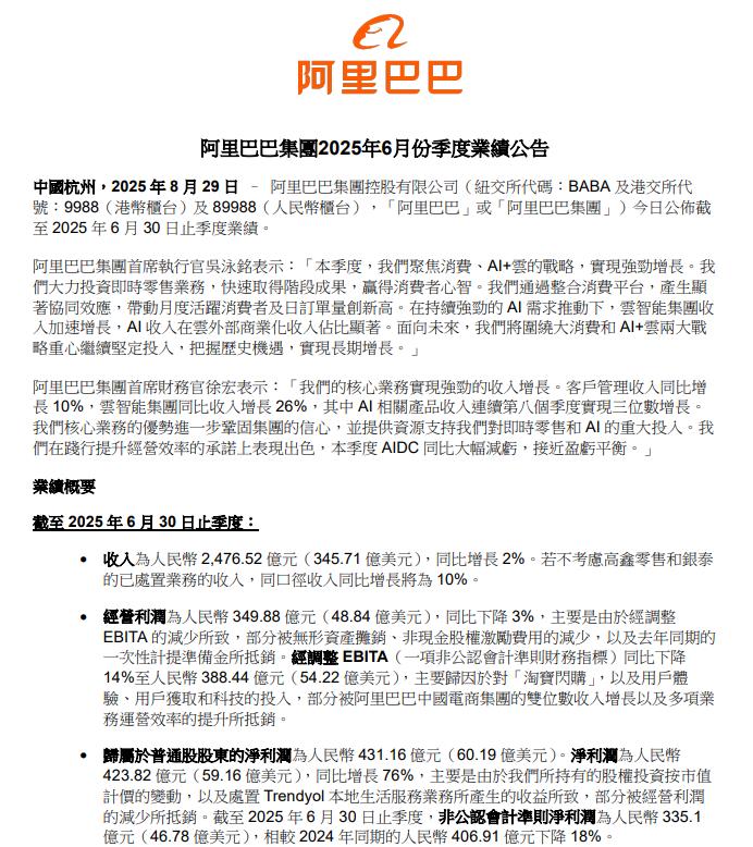 阿里巴巴公告,2026财年第一季度营收2476.5亿元,同比增长2%,若不考虑高鑫零售和银泰的已处置业务的收入,同口径收入同比增长将为10%;第一季度调整后每ADS收益 14.75元;第一财季调整后EBITDA 457.4亿元。截至2025年6月30日止季度,净利润为人民币423.82亿元,同比增长76%,非公认会计准则净利润为人民币335.1亿元,相较2024年同期的人民币406.91亿元下降18%。 ![]() (文章来源:财联社) |