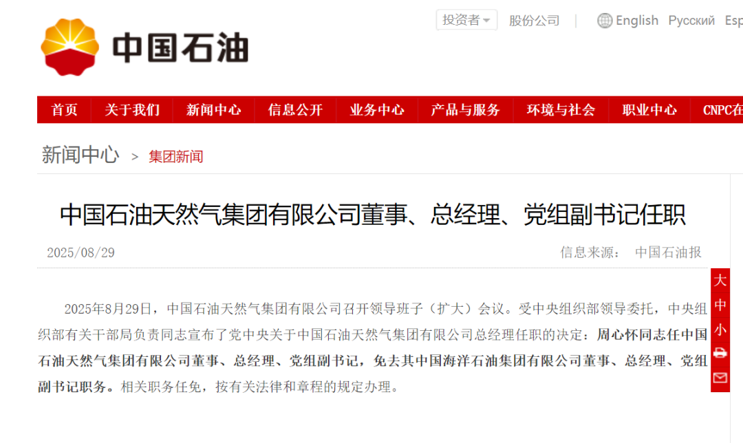 2025年8月29日,中国石油天然气集团有限公司召开领导班子(扩大)会议。受中央组织部领导委托,中央组织部有关干部局负责同志宣布了党中央关于中国石油天然气集团有限公司总经理任职的决定:周心怀同志任中国石 ...