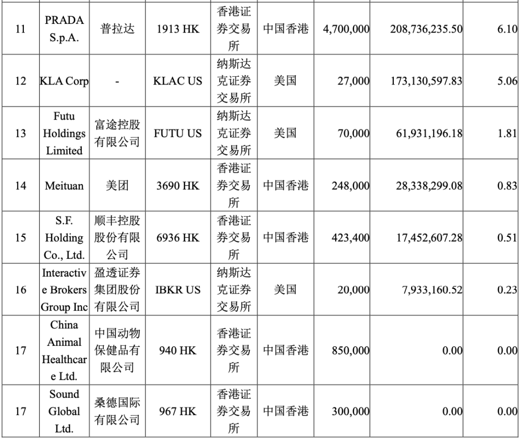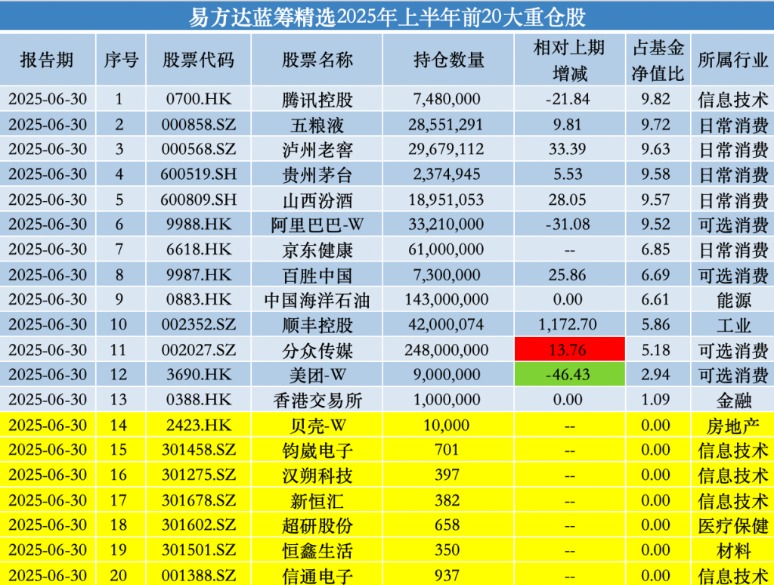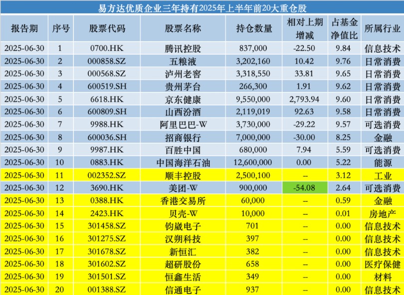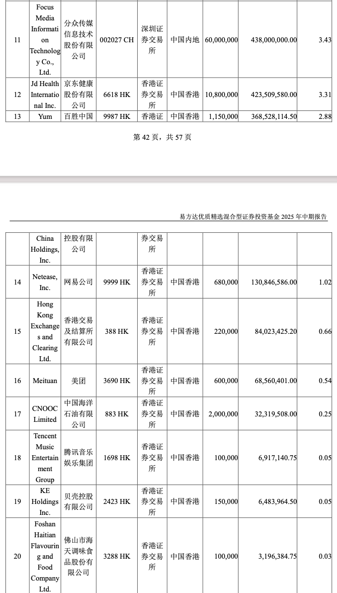 2025年上半年,张坤大幅减持美团、建仓多只“潜力股”。 8月30日零点刚过,“顶流”基金经理、易方达基金张坤披露了在管基金2025年中报,其隐形重仓股也随之曝光。 具体来看,张坤旗下几只基金首次建仓贝壳、盈透证券、腾讯音乐、钧崴电子等;并重新买回网易、海天味业。另一方面,美团、富途则遭张坤明显减仓。 “市场当前对内需预期持续悲观,然而我们认为这个观点很值得商榷。”在2025年中报中,张坤表示,“我们的持仓中有相当比例是内需相关的资产,我们很难判断市场的悲观预期会维持多久,但我们认为这种悲观预期从逻辑上不具备长期存在的基础。加上市场先生提供的好价格,长期投资者得以有机会以低估值买入一批高质量的优质上市公司股权,这样的机会是不常见的。” 大幅减持美团 目前,张坤在管4只公募基金,分别是易方达蓝筹精选、易方达优质精选、易方达优质企业三年持有、易方达亚洲精选。其中规模最大的产品是易方达蓝筹精选,同时也是张坤的代表作基金。 具体来看,2025年上半年,易方达蓝筹精选基金共持有42只股票,相较于2024年末增加了1只个股。 据此前披露的2025年二季报,在前十大重仓股中,该基金大幅增持了多只白酒股,如五粮液(000858.SZ)、泸州老窖(000568.SZ)、贵州茅台(600519.SH)、山西汾酒(600809.SH);与此同时,京东健康(06618.HK)、顺丰控股(002352.SZ)首次进入易方达蓝筹精选的持仓前十。另一方面,洋河股份(002304.SZ)、美团(03690.HK)退出持仓前十。 而其隐形重仓股则冒出了多只张坤关注的“潜力股”,第11名至第20名重仓股依次为分众传媒(002027.SZ)、美团、香港交易所(00388.HK)、贝壳(02423.HK)、钧崴电子(301458.SZ)、汉朔科技(301275.SZ)、新恒汇(301678.SZ)、超研股份(301602.SZ)、恒鑫生活(301501.SZ)、信通电子(001388.SZ)。 对比可发现,在2025年上半年,或因外卖行业竞争原因,张坤对美团减持了300万股,目前已滑落至第12大重仓股;同时洋河股份被清仓。 另一方面,分众传媒获小幅度加仓;贝壳、钧崴电子、汉朔科技、新恒汇、超研股份、恒鑫生活、信通电子均为易方达蓝筹精选成立以来首次买入的新标的。 ![]() 不仅仅是易方达蓝筹精选,易方达优质企业三年持有也在2025年上半年首次建仓了贝壳,同时,该基金也首次买入了钧崴电子、汉朔科技、新恒汇、超研股份、恒鑫生活、信通电子。 据公开资料,贝壳是领先的线上线下一体化的房产交易和服务平台。公司率先在中国打造了平台基础设施和标准,致力于重塑服务者作业模式,从而更高效地为消费者提供二手房和新房交易、房屋租赁、家装家居等其他房产交易服务。 而在此前易方达蓝筹精选大幅买入顺丰控股之后,该股也在2025年上半年闯入易方达优质企业三年持有的隐形重仓股名单,持仓数量为250万股。 值得一提的是,易方达优质企业三年持有也大幅减持了美团,持仓数量比例减少54.08%。 ![]() 新进网易、海天味业、腾讯音乐 2025年上半年,张坤另一代表作——易方达优质精选基金共持有48只个股,隐形重仓股(第11名至第20名重仓股)依次为分众传媒、京东健康、百胜中国(09987.HK)、网易(0388.HK)、中国海洋石油(0883.HK)、腾讯音乐(01698.HK)、贝壳、海天味业(03288.HK)。 其中,京东健康最早于易方达蓝筹精选今年二季度末的前十大重仓股中曝光;网易则在易方达优质精选2024年清仓卖出之后,又于2025年上半年重新买回;海天味业最早出现在易方达蓝筹精选2018年末时的腰部持仓中,不过彼时张坤买的是A股,这次则选择了港股。 与易方达蓝筹精选、易方达优质企业三年持有操作一致的是,张坤也在易方达优质精选中首次买入贝壳;同时,腾讯音乐也为首次买入的新标的。 ![]() 买入盈透证券、砍仓富途 易方达亚洲精选是张坤在管基金中规模最小的一只基金,同时也是一只QDII基金,其在2025年上半年共持有17只个股。 据此前披露的二季报,易方达亚洲精选增持了阿里巴巴(09988.HK)、华住集团(01179.HK),携程新进该基金的持仓前十;同时减持了台积电(TSM.US)、阿斯迈(ASML.US)等,富途控股(FUTU.US)、普拉达(01913.HK)则退出持仓前十。 从最新披露的隐形重仓股来看,普拉达、富途分别滑落至第11大、第13大重仓股;对比2024年末时的持仓数量来看,普拉达并未遭到减持,持股数量仍为470万股,富途则遭大幅减仓257万股。 与此同时,顺丰控股、盈透证券(IBKR.US)则首次进入易方达亚洲精选的持仓行列,持仓数量分别为42.34万股、2万股。 公开资料显示,盈透证券是一家自动化的全球电子券商。它为对冲基金、共同基金、交易所交易基金(“ETF”)、注册投资顾问、自营交易团队、引进经纪人和个人投资者提供账户托管和服务。另外,其客户可以通过第三方加密货币服务提供商使用其交易平台交易某些加密货币,这些服务提供商执行、清算和托管加密货币。 ![]() 消费者信心指数终将摆脱目前的疲弱状态 “市场当前对内需预期持续悲观,然而我们认为这个观点很值得商榷。”张坤在2025年中报中写道。 对于上述观点的理由,张坤指出,从全国居民人均可支配收入来看,2020年为32189元,2024年为41314元,4年复合增长率为6.4%。再看全国居民存款余额,2020年底是93万亿元人民币,2024年底达到152万亿元人民币,4年复合增长率是13%,大幅超过了同期人均可支配收入的增长速度。此外,如果看居民存款与贷款的差额,2020年底约30万亿元,2024年底增长到约70万亿