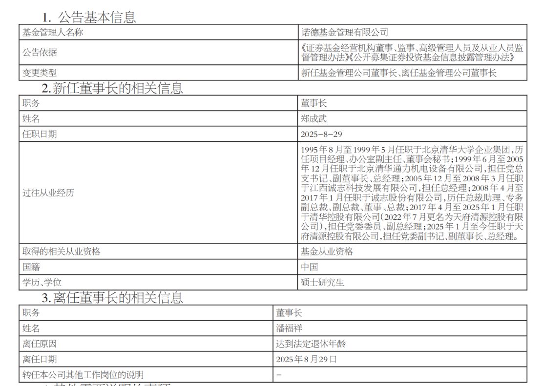 今年3月底,兴银基金原董事长吴若曼离任,由易勇代为履行董事长职务。 公开资料显示,黄德良出生于1973年4月,1996年参加工作,职业生涯起步于兴业银行福州分行、总行财务会计部;2000年赴重庆筹建分行,历任兴业银行重庆分行计划财务部、同业部、公司部和投行部负责人,后升任分行行长助理、党委委员;2012年任兴业国际信托公司党委委员、副总裁;2014年开始任华福证券党委副书记、总裁,就在今年7月初,华福证券正式宣布黄德良担任该公司党委书记、董事长。 在担任华福证券总裁11年期间,黄德良深度参与了该公司从小到大、从区域到全国的重要节点。有业内人士评价,他在银行、信托、证券等多元金融领域深耕近30年,具有覆盖金融链的战略视野,对金融业经营管理具有独到见解。 事实上,黄德良作为兴银基金控股股东方华福证券的党委书记、董事长,兼任基金子公司董事长,这类情况在业内十分常见。由股东方具有丰富金融经验的业内资深人士出任基金公司领导,也凸显了股东对基金公司和对资产管理业务的重视。 上述业内人士分析,此番人事调整,黄德良有望凭借深厚的金融行业实战经验与集团化统筹管理能力,强化基金公司和股东方的深度协同合作。 Wind数据显示,截至今年二季度末,兴银基金的管理规模为1101.23亿元,在全市场162家公募持牌机构中排在第57位。这一规模相对此前几个季度是回升的,尤其环比增加了201.47亿元,但与去年同期的1284.76亿元相比仍然有所下滑。 据悉,未来兴银基金将继续强化固收及“固收+”优势,同时布局主动权益与特色指数产品。今年以来该公司已经发行了多只指数基金、ETF和指增产品。 诺德基金也官宣新董事长,年内公募高管变更已近260人次 8月29日晚间,诺德基金也发布了关于董事长(法定代表人)变更的公告,显示该公司原董事长潘福祥因达到法定退休年龄离任,郑成武从8月29日起新任董事长。