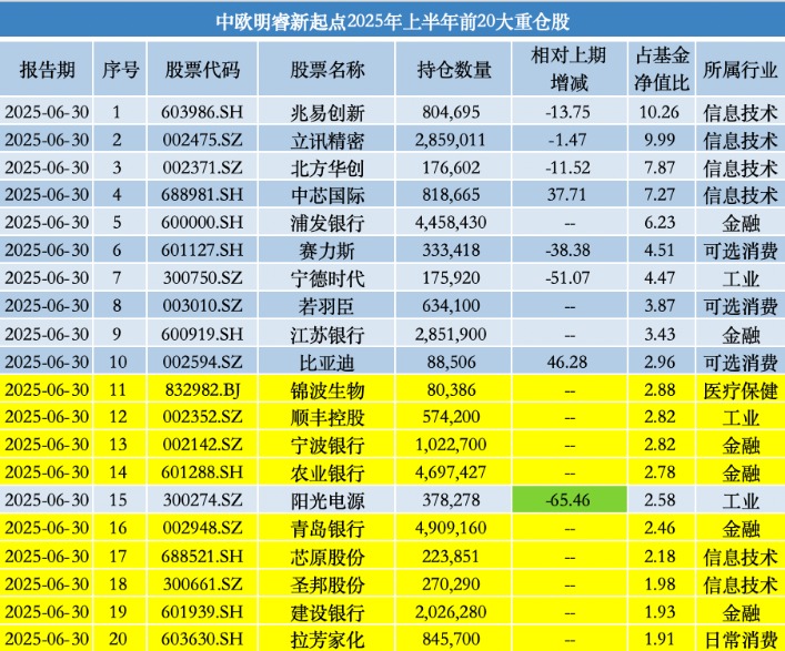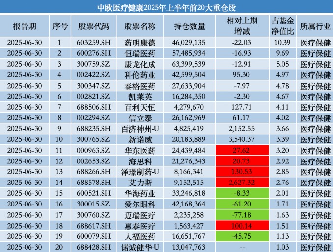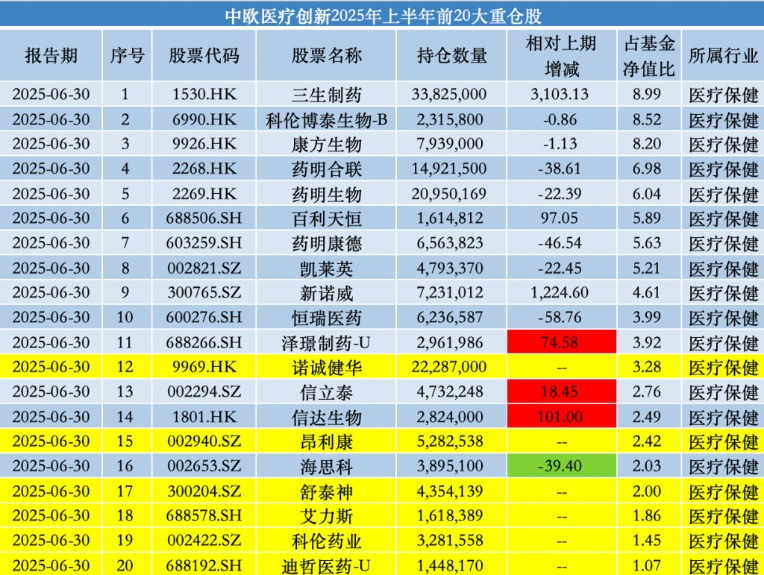 2025年上半年,中欧基金投资总监、明星基金经理葛兰挖掘了多只“新面孔”医药个股。 8月30日,葛兰在管的3只公募基金披露2025年半年报,其隐形重仓股也随之曝光。 具体来看,同为医药主题的中欧医疗健康、中欧医疗创新均大幅增持了泽璟制药-U,同时新进了诺诚健华-U、艾力斯。此外,昂利康、舒泰神、迪哲医药-U则首次出现在两只医药主题基金的持仓行列。 中欧明睿新起点则买入了多只银行股,包括宁波银行、农业银行、青岛银行、建设银行。 “综合来看,医药行业在2025年下半年将主要依靠创新突破、消费回暖及国产化维持增长动力。虽然全球经济波动与贸易摩擦等仍有潜在风险,但政策的支持和产业持续创新升级将提供有力支撑。”葛兰在2025年中报称。 首次建仓昂利康、舒泰神、迪哲医药 目前,葛兰在管3只公募基金,分别是中欧医疗健康、中欧医疗创新、中欧明睿新起点混合。其中规模最大的产品是中欧医疗健康;而此前7月4日,中欧医疗健康发布公告称,增聘赵磊为基金经理,与葛兰共同管理该产品。 具体来看,中欧医疗健康共持有142只股票。据此前披露的二季报,百利天恒(688506.SH)、信立泰(002294.SZ)、百济神州-U(688235.SH)、新诺威(300765.SZ)在二季度期间均新进中欧医疗健康的持仓前十;科伦药业(002322.SZ)获大幅增持。 与之相对的是,迈瑞医疗(300760.SZ)、爱尔眼科(300015.SZ)、东阿阿胶(000423.SZ)、华润三九(000999.SZ)退出持仓前十。 从最新披露的中报数据来看,中欧医疗健康的隐形重仓股(第11名至第20名重仓股)依次为华东医药(000963.SZ)、海思科(002653.SZ)、泽璟制药-U(688266.SH)、艾力斯(688578.SH)、华海药业(600521.SH)、爱尔眼科(300015.SZ)、迈瑞医疗(300760.SZ)、惠泰医疗(688517.SH)、人福医药(600079.SH)、诺诚健华-U(688428.SH)。 其中,在2025年上半年,艾力斯的加仓比例高达2627.32%;泽璟制药-U、惠泰医疗、华东医药、海思科也获不同程度的增持。而诺诚健华-U于2024年被葛兰清仓后,又于今年上半年被重新买回。 迈瑞医疗、爱尔眼科滑落至隐形重仓股行列,减仓幅度超半;东阿阿胶、华润三九则退出前二十大重仓股,但目前仍在中欧医疗健康的全部持仓中。此外,人福医药、华海药业也遭减持。 ![]() 再看同样是医药主题基金的中欧医疗创新,该基金也在2025年上半年大幅增持了泽璟制药-U,同时新进了诺诚健华-U、艾力斯。 此外,中欧医疗创新还首次建仓昂利康(002940.SZ)、舒泰神(300204.SZ)、科伦药业(002422.SZ)、迪哲医药-U(688192.SH)。除了科伦药业外,其余3只个股也首次出现在中欧医疗健康的腰部持仓行列。 ![]() 新进多只银行股 与前述2只基金相比,中欧明睿新起点持仓前十的所属行业并不限于医药板块。 据最新披露的中报数据,中欧明睿新起点首次建仓了多只银行股,包括宁波银行(002142.SZ)、农业银行(601288.SH)、青岛银行(002948.SZ);并于今年上半年重新买回了建设银行(601939.SH)。 此外,中欧明睿新起点还建仓了锦波生物(832982.BJ)、芯原股份(688521.SH)、拉芳家化(603630.SH);同时,葛兰还在今年上半年买回了顺丰控股(002352.SZ)、圣邦股份(300661.SZ)。 阳光电源(300274.SZ)在二季度退出该基金的前十大重仓股之后,目前位列第15大重仓股。 ![]() 创新升级、消费复苏及国产化是医药行业核心驱动力 展望2025年下半年,葛兰在2025年中报中表示,创新升级、消费复苏及国产化仍将是医药行业核心驱动力。 葛兰指出,创新药产业链有望持续推动行业增长。政策支撑有望强化,《支持创新药高质量发展的若干措施》等政策出台将进一步优化支付机制、提升研发效率和质量。投融资环境改善,港股IPO活跃度提升及科创板IPO第五套标准重启,有望改善创新生态。国产创新药活跃管线数量、临床试验数量位居全球前列,多抗、抗体偶联药物、多肽等多种治疗范式的海外授权交易有望持续。跨国药企引进的国产创新药品种也正加速推进多个适应症的全球临床试验,海外临床数据的公布将进一步验证其国际化潜力。 与此同时,葛兰认为,消费医疗板块预计继续贡献结构性机会。医美、眼科等可选消费领域,受益于居民健康意识提升与经济平稳复苏,终端需求有望进一步增长。医疗器械板块复苏趋势有望延续。招投标数据的回暖趋势确定,同时设备国产化也将持续深化,随着渠道库存的逐步清理,终端数据有望逐步向财报端体现。 “综合来看,医药行业在2025年下半年将主要依靠创新突破、消费回暖及国产化维持增长动力。”葛兰称。 葛兰表示,虽然全球经济波动与贸易摩擦等仍有潜在风险,但政策的支持和产业持续创新升级将提供有力支撑。“我们维持长期价值投资框架,继续重点布局创新药械产业链、OTC及消费医疗等核心领域,严格依据企业盈利周期、估值吸引力和经营趋势进行动态评估,力争为投资者获取稳健回报。” (文章来源:澎湃新闻) |