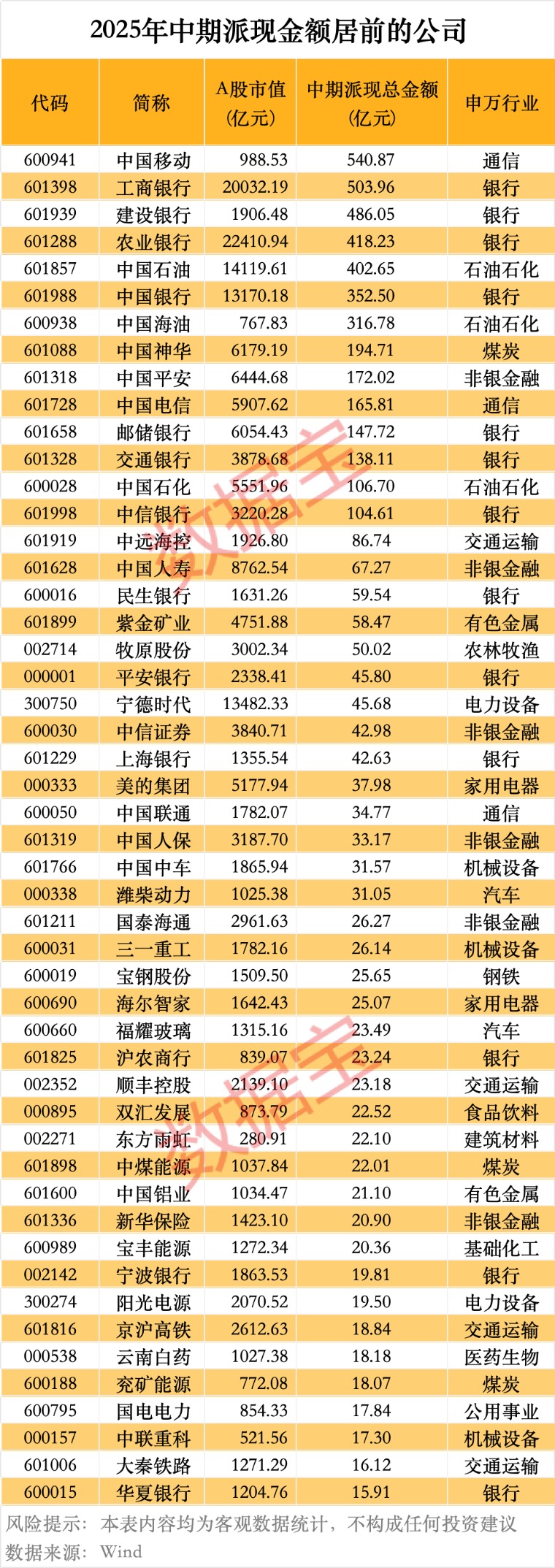 中期分红正逐渐成为新常态,回馈投资者正在从“选择题”变为“必答题”。 A股分红规模及现金分红比例创历史新高 稳定可预期的现金回报,构成价值投资的重要基石。在新“国九条”及其配套细则的政策引导下,上市公司回报投资者的意识明显提升,A股分红生态迎来深刻重塑。据证券时报·数据宝统计,截至目前,已有809家上市公司公布中期现金分红方案,派现公司数量占A股公司数量的比例达到14.91%,两项数据均创历史新高。 ![]() 中期现金分红的群体壮大的同时,派现力度也在加大。根据现金分红方案,A股公司中期派现金额合计达到6391.29亿元,占A股上半年净利润总和的比例(即现金分红比例)为21.36%,这两项数据均为历史最高水平。 ![]() 中期分红是上市公司向资本市场传递经营质量的重要信号。南开大学金融学教授田利辉表示,一批上市公司尤其行业龙头正在用真金白银对全年经营情况进行注脚,也反映出对行业发展前景的积极预期。中期分红乃至一年多次分红正逐渐成为新常态,回馈投资者正在从“选择题”变为“必答题”。 240家公司拿出一半以上盈利派现 分行业来看,银行业派现最慷慨,2025年中期派现金额将达到2375.38亿元。其次是石油石化、通信、非银金融、煤炭、交通运输等行业。 从单家公司来看,共有14家公司现金分红超过100亿元,如中国移动、工商银行、建设银行、农业银行、中国石油等,这些行业巨头构筑了本轮分红潮的“基本盘”。中国移动派现金额高居A股榜首,公司A股中期每股派发现金红利人民币2.5元(含税),合计派现总额达到540.87亿元(含港股)。 ![]() 中国中车、长安汽车、泰禾股份、中钢天源和炬芯科技等逾20家公司则首次加入中期分红行列。以长安汽车为例,公司拟每10股派送现金红利人民币0.5元(含税),合计拟派送现金人民币4.96亿元(含税)。公司表示,此次分红是在保障公司运营和长期发展方面资金需求的前提下,积极回报股东,增加公司分红频次,与股东共享公司经营发展成果,增强股东获得感,具备合法性、合规性及合理性。 以现金分红比例观察,共有240家公司将拿出本期净利润的一半以上进行分红。现金分红比例排在前五位的是硕世生物、益生股份、粤海饲料、华兰疫苗、金能科技,这5家公司今年上半年净利润均不到3000万元,但拟派现的金额均达到1亿元以上。 ![]() 以硕世生物为例,公司在利润分配方案中表示,为推动全体股东共同分享公司经营发展成果,增强投资者获得感,综合考量公司所处的发展阶段、实际经营状况以及未来发展规划等要素,公司拟实施2025年半年度分红。公司今年上半年净利润仅399万元,报告期末,公司未分配利润为25.13亿元。根据方案,公司拟每10股派发现金红利34元(含税),中期派现金额达到2.85亿元,占净利润的比例为7142.28%,现金分红比例排在A股第一位。 高股息+高增长股名单 股息率是衡量股票投资回报的核心指标,是企业盈利真实性、现金流健康度、经营稳定性的“试金石”。据数据宝统计,按中期分红方案中的每股派现金额,以及8月29日收盘价计算,共72只股票股息率达到2%以上。 东方雨虹股息率7.87%,排第一位。公司今年上半年净利润为5.64亿元,公司拟每10股派发现金红利9.25元(含税),合计派现金额达到22.1亿元。二季度末,公司获得2只社保基金组合持仓,合计持仓市值达到4.07亿元。股息率逾5%的还有思维列控、硕世生物、义翘神州。 上述股息率达到2%以上的股票中,除东方雨虹外,社保基金重仓的还有南钢股份、江中药业、华旺科技、横店东磁、普洛药业、思维列控等。 社保基金持仓占流通股比例最高的是华旺科技,二季度末社保基金109组合持仓市值为2.09亿元,持仓占比为4.26%。公司是国内装饰原纸行业的领军企业,已进入全球高端装饰原纸行业的前列。 从业绩数据来看,上述股息率达到2%以上的股票中,6股今年上半年净利润增速超50%(含扭亏为盈),分别是冰川网络、金能科技、百隆东方、思维列控、横店东磁、久祺股份。 以冰川网络为例,公司今年上半年实现净利润3.36亿元,同比扭亏为盈。报告期内,公司新增运营的游戏产品1个,截至报告期末,公司运营的游戏数量为20个,游戏类型涉及放置卡牌RPG移动游戏、SLG移动游戏等。 ![]() (文章来源:数据宝) |