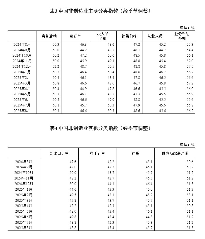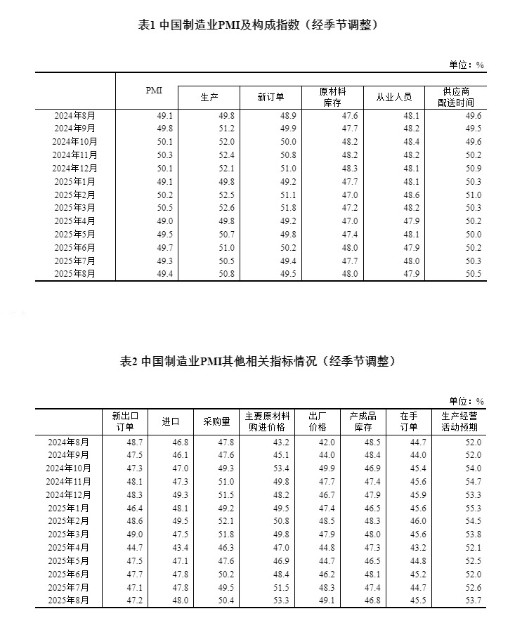 一、中国制造业采购经理指数运行情况 8月份,制造业采购经理指数(PMI)为49.4%,比上月上升0.1个百分点,制造业景气水平有所改善。 ![]() 从企业规模看,大型企业PMI为50.8%,比上月上升0.5个百分点,高于临界点;中型企业PMI为48.9%,比上月下降0.6个百分点,低于临界点;小型企业PMI为46.6%,比上月上升0.2个百分点,低于临界点。 从分类指数看,在构成制造业PMI的5个分类指数中,生产指数和供应商配送时间指数均高于临界点,新订单指数、原材料库存指数和从业人员指数低于临界点。 生产指数为50.8%,比上月上升0.3个百分点,表明制造业生产扩张加快。 新订单指数为49.5%,比上月上升0.1个百分点,表明制造业市场需求景气水平略有改善。 原材料库存指数为48.0%,比上月上升0.3个百分点,仍低于临界点,表明制造业主要原材料库存量降幅收窄。 从业人员指数为47.9%,比上月下降0.1个百分点,表明制造业企业用工景气度略有回落。 供应商配送时间指数为50.5%,比上月上升0.2个百分点,表明制造业原材料供应商交货时间持续加快。 ![]() 二、中国非制造业采购经理指数运行情况 8月份,非制造业商务活动指数为50.3%,比上月上升0.2个百分点,高于临界点,非制造业继续保持扩张。 ![]() 分行业看,建筑业商务活动指数为49.1%,比上月下降1.5个百分点;服务业商务活动指数为50.5%,比上月上升0.5个百分点。从行业看,铁路运输、水上运输、航空运输、电信广播电视及卫星传输服务、资本市场服务等行业商务活动指数位于60.0%以上高位景气区间;零售、房地产等行业商务活动指数均低于临界点。 ![]() ![]() 新订单指数为46.6%,比上月上升0.9个百分点,表明非制造业市场需求景气度改善。分行业看,建筑业新订单指数为40.6%,比上月下降2.1个百分点;服务业新订单指数为47.7%,比上月上升1.4个百分点。 投入品价格指数为50.3%,与上月持平,高于临界点,表明非制造业企业用于经营活动的投入品价格总体水平继续上涨。分行业看,建筑业投入品价格指数为54.6%,比上月上升0.1个百分点;服务业投入品价格指数为49.5%,比上月下降0.1个百分点。 销售价格指数为48.6%,比上月上升0.7个百分点,低于临界点,表明非制造业销售价格总体水平降幅收窄。分行业看,建筑业销售价格指数为49.7%,比上月上升0.5个百分点;服务业销售价格指数为48.5%,比上月上升0.8个百分点。 从业人员指数为45.6%,与上月持平,仍低于临界点,表明非制造业企业用工景气度依然偏弱。分行业看,建筑业从业人员指数为43.6%,比上月上升2.7个百分点;服务业从业人员指数为45.9%,比上月下降0.5个百分点。 业务活动预期指数为56.2%,比上月上升0.4个百分点,表明多数非制造业企业对市场发展前景较为乐观。分行业看,建筑业业务活动预期指数为51.7%,比上月上升0.1个百分点;服务业业务活动预期指数为57.0%,比上月上升0.4个百分点。 ![]() 三、中国综合PMI产出指数运行情况 8月份,综合PMI产出指数为50.5%,比上月上升0.3个百分点,持续高于临界点,表明我国企业生产经营活动总体扩张有所加快。 ![]() 附注 1.主要指标解释 采购经理指数(PMI),是通过对企业采购经理的月度调查结果统计汇总、编制而成的指数,它涵盖了企业采购、生产、流通等各个环节,包括制造业和非制造业领域,是国际上通用的监测宏观经济走势的先行性指数之一,具有较强的预测、预警作用。综合PMI产出指数是PMI指标体系中反映当期全行业(制造业和非制造业)产出变化情况的综合指数。PMI高于50%时,反映经济总体较上月扩张;低于50%,则反映经济总体较上月收缩。 2.调查范围 涉及《国民经济行业分类》(GB/T4754-2017)中制造业的31个行业大类,3200家调查样本;非制造业的43个行业大类,4300家调查样本。 3.调查方法 采购经理调查采用PPS(Probability Proportional to Size)抽样方法,以制造业或非制造业行业大类为层,行业样本量按其增加值占全部制造业或非制造业增加值的比重分配,层内样本使用与企业主营业务收入成比例的概率抽取。 本调查由国家统计局直属调查队具体组织实施,利用国家统计联网直报系统对企业采购经理进行月度问卷调查。 4.计算方法 (1)分类指数的计算方法。制造业采购经理调查指标体系包括生产、新订单、新出口订单、在手订单、产成品库存、采购量、进口、主要原材料购进价格、出厂价格、原材料库存、从业人员、供应商配送时间、生产经营活动预期等13个分类指数。非制造业采购经理调查指标体系包括商务活动、新订单、新出口订单、在手订单、存货、投入品价格、销售价格、从业人员、供应商配送时间、业务活动预期等10个分类指数。分类指数采用扩散指数计算方法,即正向回答的企业个数百分比加上回答不变的百分比的一半。由于非制造业没有合成指数,国际上通常用商务活动指数反映非制造业经济发展的总体变化情况。 (2)制造业PMI指数的计算方法。制造业PMI是由5个扩散指数(分类指数)加权计算而成。5个分类指数及其权数是依据其对经济的先行影响程度确定的。具体包括:新订单指数,权数为30%;生产指数,权数为25%;从业人员指数,权数为20%;供应商配送时间指数,权数为15%;原材料库存指数,权数为10%。其中,供应商配送时间指数为逆指数,在合成制造业PMI指数时进行反向运算。 (3)综合PMI产出指数的计算方法。综合PMI产出指数由制造业生产指数与非制造业商务活动指数加权求和而