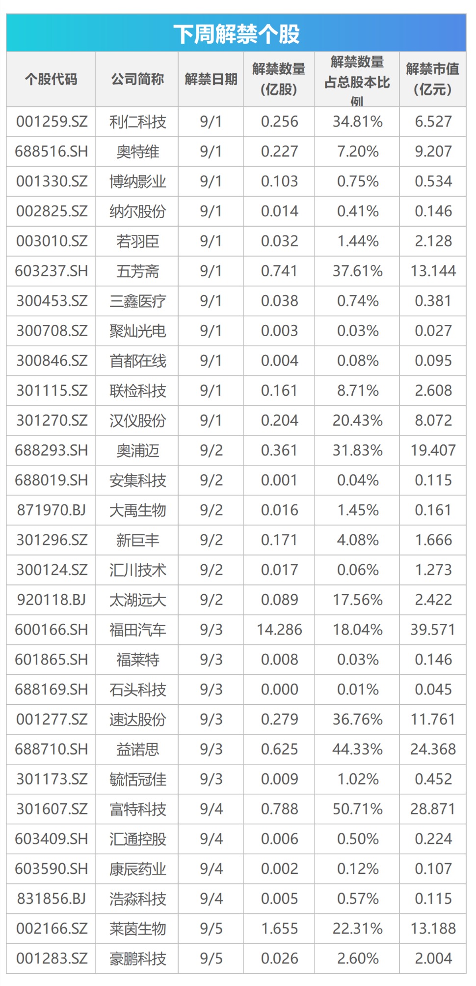 【重磅新闻】 个人消费贷款财政贴息政策将实施 9月1日,个人消费贷款财政贴息政策将正式实施。财政部、中国人民银行、金融监管总局印发《个人消费贷款财政贴息政策实施方案》,2025年9月1日至2026年8月31日期间,居民个人使用贷款经办机构发放的个人消费贷款(不含信用卡业务)中实际用于消费,且贷款经办机构可通过贷款发放账户等识别借款人相关消费交易信息的部分,可按规定享受贴息政策。 贴息范围包括单笔5万元以下消费,以及单笔5万元及以上的家用汽车、养老生育、教育培训、文化旅游、家居家装、电子产品、健康医疗等重点领域消费。对于单笔5万元以上的消费,以5万元消费额度为上限进行贴息。 多项新规9月起实施 除个人消费贷款财政贴息政策外,9月起开始实施的新规还有很多。 《关于逐步推行免费学前教育的意见》明确,从 2025年秋季学期起,免除公办幼儿园学前一年在园儿童保育教育费。 《关于领取个人养老金有关问题的通知》9月1日起实施。通知新增3种个人养老金领取情形。 新版强制性国家标准《电动自行车安全技术规范》9月1日起实施。新国标规定,具有电驱动功能的电动自行车最高设计车速不得超过25km/h。 《人工智能生成合成内容标识办法》9月1日起施行。办法聚焦人工智能“生成合成内容标识”关键点,通过标识提醒用户辨别虚假信息,明确相关服务主体的标识责任义务,规范内容制作、传播各环节标识行为。 多个消费电子新品将发布 公开信息显示,9月4日,华为将举办Mate XTs非凡大师及全场景新品发布会;同日,三星Galaxy新品线上发布会也将举办,发布会主题是“Galaxy AI”。此外,9月5日至9日,2025德国柏林消费电子展也将举行。 2025低空经济发展大会举行 2025第四届低空经济发展大会将于9月5日在安徽芜湖举办。本次大会以“场景创新引领安全有序发展”为主题,将涵盖会议、展览、演练、发布等板块,除开幕式和主报告会外,还将举办十余场平行论坛,汇聚国内外权威专家学者与行业领军人物,共同探讨低空经济安全、健康、有序的发展路径。 逾188亿元市值限售股解禁 Wind数据统计显示,下周(9月1日至5日)共有29家公司限售股陆续解禁,合计解禁20.13亿股,按8月22日收盘价计算,解禁总市值为188.77亿元,均较本周大幅减少。 个股来看,福田汽车、富特科技、益诺思、奥浦迈、莱茵生物、五芳斋、速达股份等解禁市值较大,均超过10亿元。 ![]() 【新股机会】 下周将有1只新股发行 Wind数据显示,下周将有1只新股发行。艾芬达将在9月1日发行,本次发行价格为27.69元/股,申购代码为301575。 ![]() (文章来源:第一财经) |