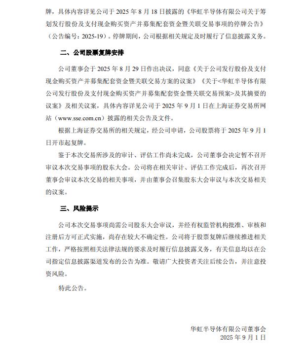 华虹公司(688347.SH)公告称,公司拟以发行股份及支付现金的方式向上海华虹(集团)有限公司、上海集成电路产业投资基金股份有限公司、国家集成电路产业投资基金二期股份有限公司、上海国投先导集成电路私募投资基金合伙企业(有限合伙)等4名上海华力微电子有限公司股东购买其持有的华力微97.4988%股权并募集配套资金。公司股票将于2025年9月1日开市起复牌。本次交易事项尚需公司股东大会审议,并经有权监管机构批准、审核和注册后方可正式实施,尚存在较大不确定性。 ![]() ![]() (文章来源:财联社) |