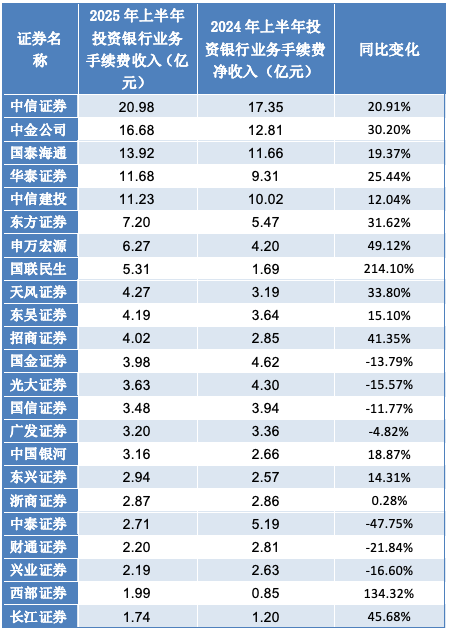 2025年上半年,证券行业交出了一份超出市场预期的“成绩单”。 42家A股上市券商的半年度报告均已披露完毕,合计实现营业收入2518.66亿元,同比增长30.8%;合计实现归母净利润1040.17亿元,同比增长65.08%。其中,37家券商营收和净利润均实现同比正增长,仅有少数券商营收出现下滑。 随着市场回暖、活跃度提升,券商证券自营投资业务收入显著增长,经纪业务手续费净收入有所提升,投行业务也迎来回暖。业内人士认为,券商板块的定价逻辑正从传统的波动较大的“贝塔”交易品种,向具备长期配置价值的“价值股”转变。 头部券商发挥稳定 中小券商爆发 头部券商发挥稳定,中信证券、国泰海通、华泰证券、广发证券、中国银河、中金公司、申万宏源、国信证券、中信建投、招商证券十家券商上半年的营收都突破百亿元大关。 中信证券以330.39亿元的营收稳坐“头把交椅”,并创历史中期最好水平;国泰海通公布合并后首份半年报,营收规模为238.72亿元,位列第二;华泰证券、广发证券两家券商营收均在150亿元以上。 ![]() 从归母净利润来看,国泰海通、中信证券的归母净利润均超百亿元,华泰证券以75.49亿元位列第三,广发证券、中国银河、国信证券、招商证券的归母净利润均在50亿元以上。 中小券商里也不乏有表现亮眼的公司。国联民生合并后,上半年营业收入为40.11亿元,同比增幅达269.4%;归母净利润为11.27亿元,同比大幅增长1185.19%。 东北证券、华林证券、国海证券、国金证券、长江证券归母净利润也显著增长,同比分别增长225.9%、172.72%、159.26%、144.19%、120.76%。 不过也有些券商出现营收下滑,浙商证券上半年营收同比下降23.66%,西部证券营收同比下降16.23%,南京证券、财通证券营收也有所下滑。 浙商证券表示,营业收入减少的原因主要系衍生金融工具市场价格下降,引发公司公允价值变动收益较上年同期减少30.22%。财通证券称,主要原因是投资银行业务手续费净收入、资产管理业务手续费净收入、投资收益及公允价值变动收益同比有所下降。 自营、经纪业务驱动高增长 机构数据显示,2025年上半年,上交所A股新开户达1260万,同比增长32.8%,在前期高基数的基础上继续保持高增长态势。市场参与热情的提升也推动今年上半年的日均成交额同比大幅增长61%至1.39万亿元。 在这样的市场环境下,今年上半年,经纪业务和自营业务成为推动证券行业业绩增长的主要动力。 以“公允价值变动净收益+投资净收益-对联营企业和合营企业的投资收益”的口径计算,36家上市券商自营收入均录得同比增长,6家下滑。 其中,中信证券以190.52亿元的自营收入位列第一,国泰海通以93.52亿元排名第二,中国银河、中金公司的自营业务收入均在70亿元以上,华泰证券、国信证券、广发证券的自营业务收入均在50亿元以上。浙商证券自营收入同比增长146.38%至14.16亿元。 “权益自营是券商业绩弹性的重要来源之一,也是券商板块的重要选股思路。而权益业务的弹性来源,以自营业务为主,辅以部分投行跟投、私募股权跟投等。”国泰君安非银金融研究团队指出。 经纪业务方面,中信证券和国泰海通两家券商的收入均超过50亿元,分别为64.02亿元和57.33亿元;广发证券、华泰证券、招商证券、中国银河、国信证券以及中信建投证券的经纪业务收入则介于30亿元至40亿元之间。 中信建投非银金融团队指出,政策端,“活跃资本市场”导向明确,注册制深化、交易机制优化、引入中长期资金等举措持续落地,直接拓宽了券商投行、经纪、资管等业务空间。资金端,市场信心修复带动成交回暖与两融回升,叠加养老金、保险等增量资金入市可期,为券商业绩提供弹性基础。 ![]() 华西证券指出,本轮券商“慢牛”行情反映出其定价逻辑正从传统的“贝塔”交易品种向具备长期配置价值的“价值股”转变。 招商证券表示,考虑到往年低基数加持,券商板块年内稳增无虞。预计2025年行业实现总营收4741亿元,同比增长5%;实现净利润1825亿元,同比增长9%。 投行业务回暖 “马太效应”显著 经历2024年的“寒冬”后,今年上半年A股IPO市场明显回暖,首发上市企业数量、融资额双双上升,港股更是掀起一轮上市热潮。 上市券商上半年投行业务收入亦出现回暖。Choice数据显示,42家上市券商2025年上半年合计实现投资银行业务手续费收入155.3亿元,同比增长11%。 ![]() 从收入排名来看,5家头部券商投行业务手续费收入超过10亿元。其中,中信证券上半年投行业务手续费收入为20.98亿元,同比增长20.91%;中金公司为16.68亿元,同比增长30.32%;国泰海通、华泰证券、中信建投等投行业务手续费收入也超过10亿元。 就增幅来看,上半年,华安证券、中银证券等多家中小券商投行收入同比增幅均超100%。华安证券在半年报中表示,投行业务加速从项目投行向客户投行、产业投行、综合投行转变,在并购重组业务形成了一定优势,打造了部分债券融资业务特色项目。此外,光大证券、财通证券等券商投行业务收入同比出现下滑。 国泰海通证券非银首席分析师刘欣琦称,A股股权融资节奏边际上有所改善,港股持续活跃、同比提振显著,企业客户资源、专业服务能力以及跨境服务能力更具优势的头部券商有望在投行业务生态演进的过程中继续维持领先地位。随着融资端改革不断落地,预计服务新质生产力和提升并购重组服务能力有望成为投行业