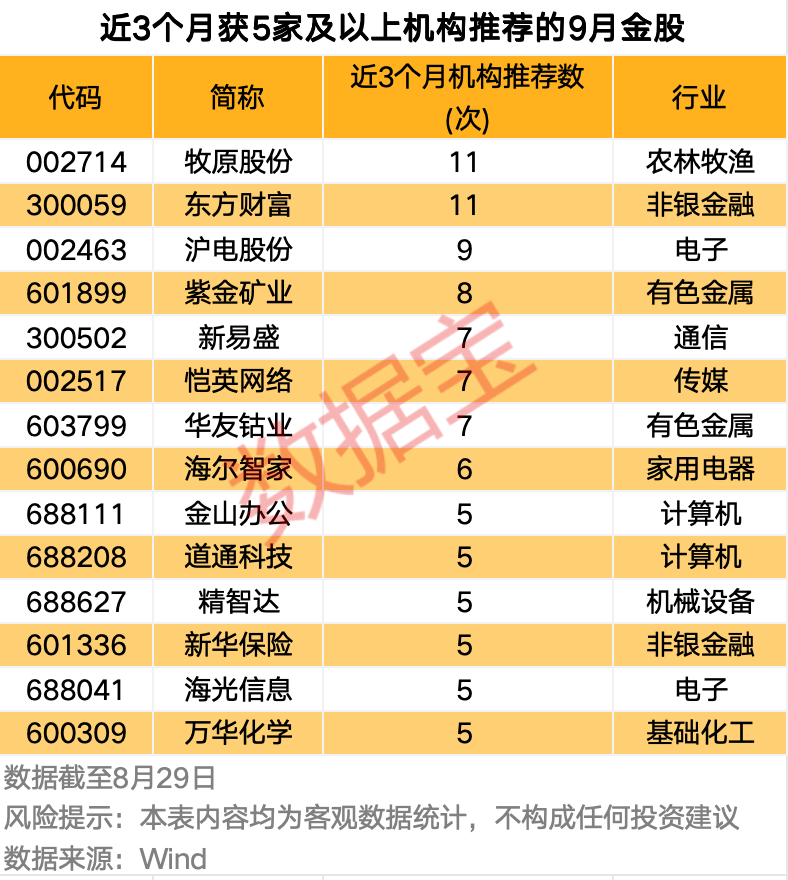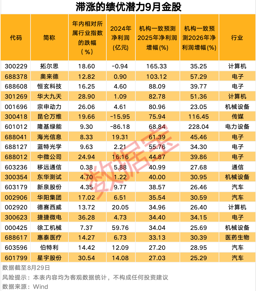 大盘能否延续上涨行情? 机构普遍乐观预期后市行情 今年8月,中国资产大幅领涨,科创50指数月度涨幅高达28%,创业板指涨超24%,上证指数涨近8%,前两只指数涨幅均创历史同期新高,上证指数在近年来同期的涨幅处于较高水平。 从历年9月的市场表现来看,2000年以来上证指数上涨概率约50%,创业板指上涨概率略低于上证指数,科技100指数上涨概率较低,800消费指数上涨概率较高,达到60%。 ![]() 机构普遍看好后市行情。光大证券认为,支撑股票市场上涨的逻辑并没有发生变化,市场估值目前也较为合理,并未出现明显透支。此外,还有一些新的积极因素正在出现,如美联储降息周期可能会开启、公募资金发行出现回暖。中泰证券表示,流动性因素助力市场走牛,往后看,流动性有望驱动市场继续上涨,同时还需要基本面的配合。 9月金股出炉,汽车行业获重点推荐 机构发布策略观点的同时,也会公布9月金股。据证券时报·数据宝统计,截至8月29日,国金证券、国信证券和中泰证券等机构推荐110只9月金股。 从行业来看,9月金股覆盖24个申万一级行业,汽车行业个股数量最多,共计13只,电子、机械设备行业各10只,计算机、电力设备等8个行业均超过5只。 6股获2家及以上机构推荐为9月金股。中兴通讯获国信证券、中泰证券及华泰证券3家机构推荐为9月金股。国信证券表示,中兴通讯是国内通信设备头部企业,受益AI发展,芯片侧有望突破,未来盈利能力有望提升。 金山办公获东兴证券及华泰证券2家机构推荐。东兴证券表示,金山办公作为国内办公软件龙头,成长空间广阔,竞争格局优异;WPS业务有望受益于信创业务修复。叠加AI功能商业化的加速落地,公司中长期成长性有望进一步打开。 另外,新易盛、晶晨股份、雷赛智能等个股均获2家机构推荐。 从近3个月推荐次数来看,9月金股中,超半数获2家及以上机构推荐为热门金股,牧原股份、东方财富、沪电股份、金山办公等14股获5家及以上机构推荐。 东方财富近3个月获11家机构推荐。中泰证券推荐公司为9月金股,该机构认为市场交投持续活跃带动公司估值与业绩共振向上。 贵州茅台近3个月获2家机构推荐。东兴证券推荐公司为9月金股,该机构表示,在白酒行业整体疲软的背景下,公司上半年净利润和营收保持增长实属不易。作为行业龙头,公司业绩稳健,全年销售目标完成可期。 ![]() 9月金股年内平均涨幅超过40% 从市场表现来看,9月金股年内平均涨幅超过40%,仕佳光子和新易盛等个股均涨超100%。 ![]() 热门股新易盛年内涨幅超330%。中原证券表示,公司硅光模块、相干光模块等研发项目取得突破,受益于全球AI基础设施建设,高速率光模块需求旺盛。 福达股份年内涨幅超155%,公司是国内汽车离合器及发动机锻钢曲轴主要生产企业之一;华锐精密年内涨幅超120%,公司是国内先进的硬质合金切削刀具制造商。2家公司均涉及机器人概念,均获中泰证券推荐为9月金股。 年内表现较为一般的金股主要分布在传统行业。比如,食品饮料的甘源食品、纺织服饰行业的华利集团年内分别下跌36.1%、29.67%;煤炭行业的中国神华及基础化工行业的万华化学年内股价也均下跌。 从业绩来看,9月金股净利润连续2年上半年保持增长趋势。今年上半年整体实现净利润近3200亿元,同比增长超20%,增幅创近3年同期新高。其中,不少个股受益于“反内卷”行动或涨价,业绩迎来反转或亏损收窄。智明达、仕佳光子、牧原股份今年上半年净利润同比增幅均超10倍。 除迈威生物-U、新诺威外,年内涨幅超过100%的9月金股上半年均实现盈利。仕佳光子今年上半年净利润2.17亿元,同比增长超17倍;新易盛今年上半年净利润同比增长超350%。 20只金股绩优且滞涨 据数据宝统计,年内跑输所属行业指数涨幅,且机构一致预测公司2025年、2026年净利润增幅持续超过20%的9月金股共有20只。 20股主要分布于电子、计算机、机械设备、汽车等行业。捷捷微电年内涨2.06%,所属电子行业年内涨幅超38%;星宇股份年内下跌8.44%,所属汽车行业年内涨幅超22%。 奥来德、恒玄科技、华大九天获机构一致预测2025年、2026年净利润增幅均有望超35%,3股年内均大幅跑输所属行业指数。 ![]() (文章来源:证券时报网) |