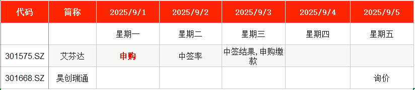 上周新股的上市首日涨幅达到205.13%,本周新股申购迎来卫浴毛巾架头部企业。 澎湃新闻根据Wind及公开信息梳理统计,本周(9月1日至9月5日)有1只新股安排申购,为江西艾芬达暖通科技股份有限公司(下称“艾芬达”,301575)。 艾芬达从事暖通家居产品和暖通零配件的研产销,主要产品包括卫浴毛巾架系列产品和温控阀、暖通阀门、磁性过滤器等暖通零配件。公司聚焦海外市场,报告期间外销业务收入占比稳定在90%上下、主要来源于以英国为主的欧洲地区,与King fisher、TravisPerkins、OBI Group、Kartell UK等欧洲知名客户具有长期稳定性合作。 ![]() 一、本周新股申购 从时间表看,艾芬达(301575)将在本周一(9月1日)申购,该公司发行价为27.69元/股,网上发行申购上限5000股,顶格申购需配深市市值5万元。 值得一提的是,上一只创业板新股还是8月1日发行的广东建科。这是时隔一月,又有创业板新股发行。 ![]() 据华金证券研报,艾芬达从事暖通家居产品和暖通零配件的研产销,主要产品包括卫浴毛巾架系列产品和温控阀、暖通阀门、磁性过滤器等暖通零配件。依托较强的研发及生产能力,公司成为卫浴毛巾架产品的领先供应商,客户资源优势显著。 公司精准聚焦海外市场,报告期间外销业务收入占比稳定在90%上下、主要来源于以英国为主的欧洲地区。得益于在研发及生产能力上的优势,公司获得了King fisher、TravisPerkins、OBI Group、Kartell UK等欧洲知名建材产品、卫浴产品、暖通产品的批发商、零售商、品牌商的较高认可;与上述客户的合作时长均达5年以上、具有长期稳定性。 根据业务的相似性,华金证券选取苏泊尔、爱仕达、哈尔斯、嘉益股份、好太太为艾芬达的可比上市公司。从上述可比公司来看,2024年度可比公司的平均收入规模为66.16亿元、平均PE-TTM为15.19X、销售毛利率为33.64%;相较而言,公司营收规模及销售毛利率暂未及同业平均。 二、上周新股回报 从时间表看,本周暂无新股上市安排。上周共有1只新股上市,为上海巴兰仕汽车检测设备股份有限公司(下称“巴兰仕”,920112)。 上周,新股市场“赚钱效应”继续,巴兰仕的上市首日涨幅超过200%,达到205.13%,单签浮盈1.62万元。 具体而言,8月28日,巴兰仕在北交所正式挂牌上市,发行价为15.78元/股,截至上市首日收盘,该股报48.15元/股,涨幅为205.13%。以收盘价计算,投资者中一签浮盈为1.62万元。 三、上周A股IPO上会 发审委审核方面,上交所、深交所、北交所上周均召开新一期上市审核委员会审议会议。其中,拟在创业板IPO的纳百川新能源股份有限公司(下称“纳百川”)、拟在北交所IPO的江苏省精创电气股份有限公司(下称“精创电气”)、拟在科创板IPO的厦门恒坤新材料科技股份有限公司(下称“恒坤新材”),均成功过会。 而拟在科创板IPO的西安泰金新能科技股份有限公司(下称“泰金新能”),首发事项暂缓表决。 本周,上交所和深交所将继续开审。 9月5日,深交所将审议中国铀业股份有限公司(下称“中国铀业”)的首发事项。公司是专注于天然铀和放射性共伴生矿产资源综合利用业务的矿业公司,报告期内主要从事天然铀资源的采冶、销售及贸易,以及独居石、铀钼等放射性共伴生矿产资源综合利用及产品销售。公司是我国天然铀保障供应的国家队、主力军,是我国核工业体系的重要组成部分,是国际天然铀产业发展的重要参与者、建设者和推动者,致力于建设“以铀为本、国际一流”的矿业公司,承担着打造“强核基石、核电粮仓”的历史使命。 9月5日,上交所将审议江苏锡华新能源科技股份有限公司(下称“锡华科技”)的首发事项。公司主要从事大型高端装备专用部件的研发、制造与销售,产品结构以风电齿轮箱专用部件为主、注塑机厚大专用部件为辅,是全球行业领先、质量可靠、技术卓越的大型高端装备专用部件制造商。公司产品主要应用于大型风电装备与注塑机领域,公司是国内少数可提供风电齿轮箱专用部件全工序服务的企业,致力于成为新能源风电领域的全球顶尖大型高端装备专用部件制造商。 四、港股最新动态 Wind数据显示,本周(9月1日至9月5日)港股的奥克斯电器(02580.HK)将在本周一申购缴款,并于本周二上市。 ![]() 上周,港股共有17家企业递交招股书,其中10家为首次递交,7家为更新招股书。 可孚医疗科技股份有限公司、深圳飞骧科技股份有限公司、山推工程机械股份有限公司、深圳市博铭维技术股份有限公司、安得智联供应链科技股份有限公司、圣火科技集团有限公司、北京天星医疗股份有限公司、安徽希磁科技股份有限公司、纳真科技公司、InxMed Limited等10家为首次递交。 奇瑞汽车股份有限公司、八马茶业股份有限公司、河北海伟电子新材料科技股份有限公司、Seyond Holdings Ltd.、无锡先导智能装备股份有限公司、荣联再生科技国际有限公司、成都国星宇航科技股份有限公司等7家公司为更新招股书。 白鸽在线(厦门)数字科技股份有限公司、Uni-Star Interactive Holding Limited等2家公司的申请失效。 劲方医药科技(上海)股份有限公司的聆讯通过。 五、投融资大事记 1、8月25日,跃然创新(Haivivi)宣布完成2亿元A轮系列融资。本轮融资由中金资本旗下基金、红杉中国、华山资本、愉悦资本领投,招银国际等共同参投,Brizan Ventures等老股东持续加注。 2、8月25日,三一氢能有限公司完成数亿元人民币A轮融资