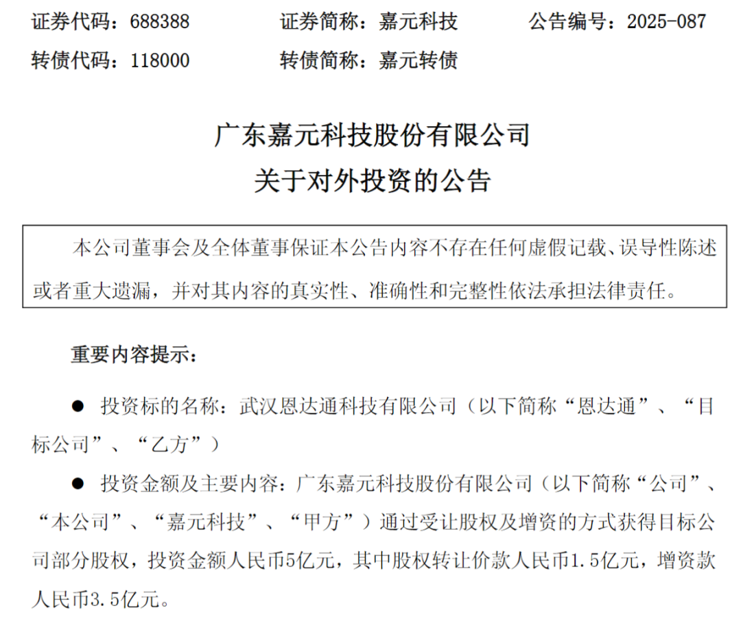 如火如荼的“AI新基建”领域,杀入一位锂电铜箔“老将”。 8月29日晚,嘉元科技(688388)公告称,公司拟投资5亿元,通过“股权转让+增资”组合方式获得武汉恩达通科技有限公司(以下简称“恩达通”)13.59% ...