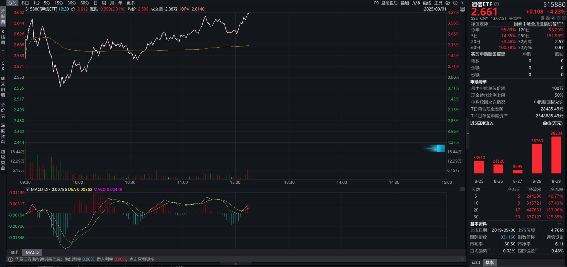 每经编辑|肖芮冬 9月1日开盘,受近期多家算力产业链龙头陆续披露半年报,业绩普遍大增提振,光模块CPO概念持续强势。通信ETF(515880)盘中涨超4%,截至发稿,通信ETF年内二级市场涨幅超94%,居A股ETF榜首。 资金成交也较为活跃,上一交易日资金大幅买入近10亿元。截至8月29日,通信ETF近20日吸金超44亿元,当前规模超95亿元。 近期,通信板块为何如此强势? 政策层面,《关于深入实施“人工智能+”行动的意见》提出,到2027、2030年,新一代智能终端、智能体的应用普及率超过70%、90%,目标超预期,对国产算力产生催化。在AI基础设施投入>增加tokens与DAU>继续加大基建投入的商业模式下,通信企业业绩具有较高的前景。 基本面视角,海外内资本开支持续提振AI产业链需求。根据TrendForce预测,2025年中国AI服务器市场中,英伟达、AMD等外采芯片比例将从2024年的63%降至42%,本土芯片供应商占比则有望提升至40%,国产替代已成大势。本周五晚阿里重申,将在未来三年持续投入3800亿元用于AI资本开支,并称自研AI芯片正式进入测试阶段,有望填补英伟达的空白。 通信ETF(515880):“光模块+服务器+光纤+铜连接”占比超75% 光模块是光电转换的部件。它把服务器/交换机内部的电信号转换成光信号,通过光纤进行远距离、高速率的传输,到达目的地后再转换回电信号。现代AI数据中心通常由成千上万个GPU组成计算集群。这些GPU之间需要极高的通信带宽和极低的延迟来协同工作光模块(特别是高速率如800G、1.6T)是连接这些计算节点、存储节点和交换机的核心部件。光模块、光纤、铜连接等数据传输的核心部件毫无疑问是算力板块至关重要的环节之一。 在海内外算力基础设施持续投入的背景下,光模块市场有望维持高景气度。截至8月29日,通信ETF(515880)规模超95亿元,“光模块+服务器+铜连接+光纤”占比超过75%,良好的代表了算力硬件的基本面。其中,光模块占比超过48%,服务器占比接近20%,光纤占比超过7%,可以关注相关布局机会。(权重数据均截至8月27日) 没有股票账户的投资者可以关注通信ETF联接基金(联接A:007817;联接C:007818)。 注:数据来源wind。 |