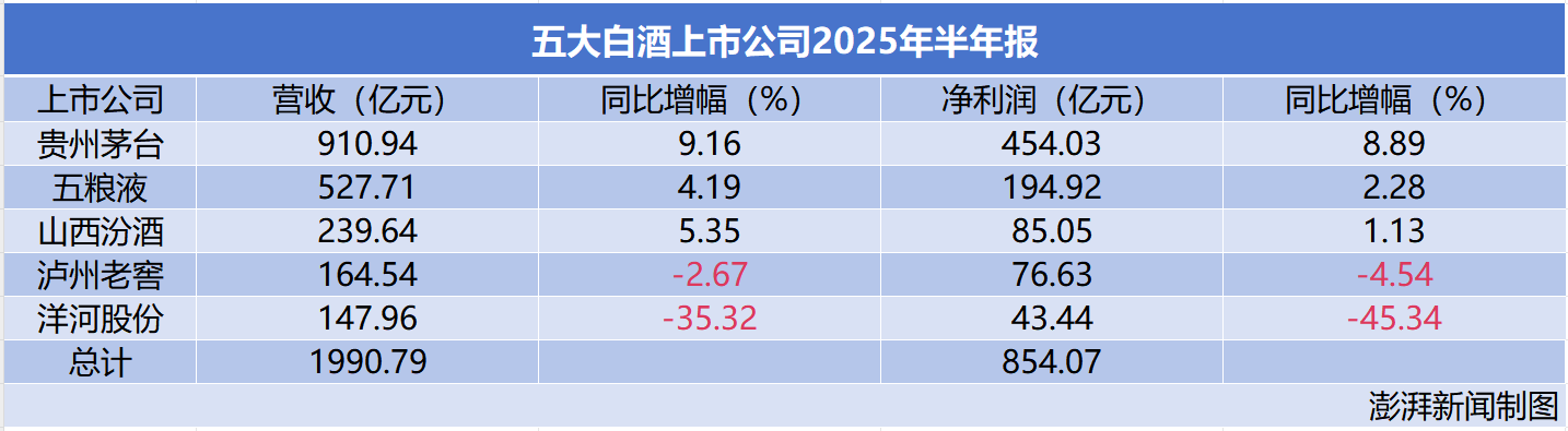 五大白酒公司上半年净利润总计超850亿元,“茅五汾”营收和净利润增速均降至个位数,泸州老窖和洋河股份业绩下滑。 截至8月29日,五大白酒上市公司半年报均已披露。具体来看,贵州茅台(600519.SH)、五粮液(000858.SZ)、山西汾酒(600809.SH)、泸州老窖(000568.SZ)、洋河股份(002304.SZ)上半年营业收入分别为910.94亿元、527.71亿元、239.64亿元、164.54亿元、147.96亿元,同比增速依次为9.16%、4.19%、5.35%、-2.67%、-35.32%;归母净利润分别为454.03亿元、194.92亿元、85.05亿元、76.63亿元、43.44亿元,增速依次为8.89%、2.28%、1.13%、-4.54%、-45.34%。 ![]() 据记者计算,五大白酒公司上半年营收总计1990.79亿元,归母净利润总计854.07亿元。其中,贵州茅台净利润454.03亿元,超过另外四家净利润的总和,在五家总计净利润中占比达53.16%。上半年共181天,贵州茅台日均赚2.5亿元。 需要指出的是,五大白酒巨头上半年业绩分化明显。其中,贵州茅台、五粮液、山西汾酒营收和净利润均创历史新高,但增速均降至个位数;泸州老窖、洋河股份营收和净利润均下滑。其中洋河股份业绩下滑较为明显,营收同比降超三成,净利润同比降超四成。 酒类分析师蔡学飞对澎湃新闻记者表示,根据2025年上半年财报数据,白酒行业整体承压态势明显,行业依然面临深度调整,其中包括量价齐跌,高端酒批价倒挂严重,库存周转天数持续高位,多数企业面临价格与渠道多重压力;同时消费结构剧变,政务及商务宴请需求锐减,婚宴和家庭自饮成主力场景,消费价格带向100元-300元大众价格带下沉;行业集中度进一步提升,头部效应强化,中小酒企普遍业绩腰斩,分化持续加剧。 “茅五汾”业绩保持个位数增长,洋河股份净利润降超四成 总体来看,尽管增速放缓,贵州茅台上半年业绩仍处于领跑地位。据Wind数据,贵州茅台上半年总营收9.16%的增速,为2015年来首次出现个位数的增幅。而上半年8.89%的净利润增速也是2021年来再次出现个位数增幅,并创下2015年以来新低。在2024年年报中贵州茅台提到,对于2025年主要目标,计划实现营业总收入同比增长9%左右。中原证券研报分析称,上半年茅台酒和系列酒的营收增长均收窄,其中系列酒增长放缓幅度较大。 ![]() 贵州茅台近年来业绩表现,来自Wind数据 对于贵州茅台业绩,酒业独立评论人肖竹青对澎湃新闻表示,贵州茅台核心大单品500毫升飞天茅台酒控量保价取得阶段性成果。肖竹青分析认为,贵州茅台管理层当前的“控量稳价+多元场景+文化增量”组合策略,是其应对市场分化的关键,短期稳固基本盘,长期培育新的增长极。 五粮液上半年营收增4.19%,净利润增2.28%。公司半年报称,经营业绩继续保持稳健增长。据Wind数据,五粮液上半年营收和净利润均创历史新高,但增速均降至个位数。此前,从2016年至2024年,五粮液上半年营收和净利润均保持着两位数增长。 山西汾酒上半年营收增5.35%,净利润增1.13%。据Wind数据,其营收和净利增速均为自2016年中期以来最低。肖竹青把山西汾酒的产品结构概括为“玻汾夯基、青花拉升、老白汾与巴拿马补位”,他认为,“高、中、低”全线覆盖而又重点突出的矩阵,是山西汾酒对冲行业需求下行的最大护城河。 相比“茅五汾”,上半年泸州老窖和洋河股份业绩均下滑。 其中,泸州老窖上半年营收降2.67%,净利润降4.54%,而在此前,公司营收和净利润连续四年保持两位数增长。 洋河股份上半年营收降35.32%,净利润降45.34%。据Wind数据,其上半年营收、净利润降幅均为自2009年上市以来最大。对于业绩下滑,洋河股份在财报中直言,“主要系白酒销售市场行情影响,致使产品销售量和销售收入下降。” 五家白酒公司合同负债较上年末均下降,洋河股份降幅最大 合同负债一定程度上被视为企业业绩增长的“蓄水池”,对于白酒企业而言,通常代表了经销商的打款意愿。据记者梳理,报告期末五大白酒企业的合同负债较上年末均下降。 其中,五粮液合同负债规模最大,为100.77亿元;洋河股份合同负债降幅最大,为43.17%。据半年报,与上年末相比,报告期内,贵州茅台、五粮液、山西汾酒、泸州老窖、洋河股份合同负债降幅依次为42.59%、13.8%、31.01%、43.17%、11.29%。 具体来看,贵州茅台报告期末合同负债为55.07亿元,较上年末95.92亿元下降42.59%。半年报解释称,主要是经销商预付货款减少。 五粮液报告期末合同负债为100.77亿元,比上年末116.9亿元下降13.8%。 山西汾酒报告期末合同负债59.83亿元,比上年期末86.72亿元下降31.01%。据半年报,主要系本期预收货款确认收入所致。 洋河股份报告期末为58.78亿元,比上年末的103.44亿元下降43.17%。半年报称,主要系上年末预收经销商货款本期发货符合收入确认条件结转收入所致。 泸州老窖报告期末合同负债35.29亿元,比上年末的39.78亿元下降11.29%。 与此同时,五大白酒公司的存货资产高企。上半年,贵州茅台存货规模最大,高达549.72亿元;其次为洋河股份的190.75亿元。从存货在总资产中的占比来看,洋河股份比例最高,为31.14%。 贵州茅台期末存货549.72亿元,在总资产中占比18.81%。五粮液期末存货177.46亿元,在总资产中占比9.18%。山西汾酒期末存货131.98亿元,在总资产中占比23.32%。泸州老窖期末存货137.85亿元,在总资产中占比19.64%。洋河股份期末存货190.75亿元,在总资产中占比31.14%。 白酒“年轻化”成关注焦点,酒企在低度酒、光瓶酒等方面发力 在行业深度调整的大背景