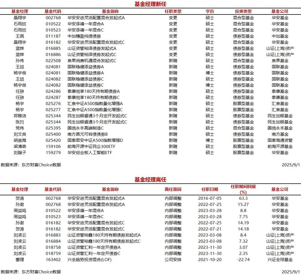 每经AI快讯,据东方财富Choice数据统计,今日新聘基金经理16人,涉及20只基金(A/C类分开计算),主要来自华安基金、国联基金等公司。另外,今日有5位基金经理离任。 ![]() |